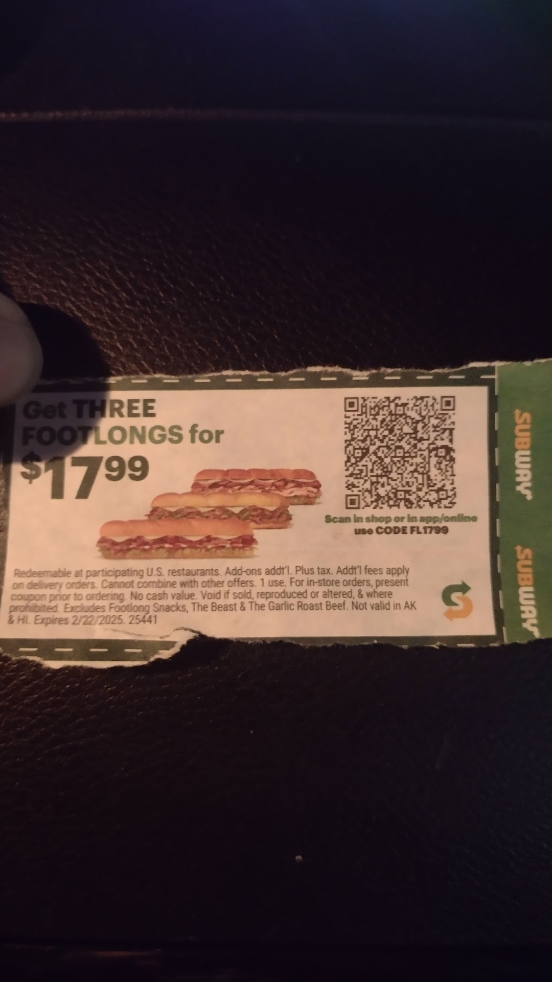 Read moreUsually this location is spot on. Unfortunately it wasnât the case this time. I ordered a mobile order for 2 foot longs and was supposed to be ready by 7:10. We got there and it wasnât ready and there was 2 orders in front of mine still, so I gave it a little more time. By the time I actually got my order it was 25 minutes late. The poor guy up front was drowning in mobile orders and there was someone in the back apparently oblivious. The guy up front has only been there for 3 weeks and the guy in the back was his âtrainerâ. If that was my experience being that new, I would have found a...