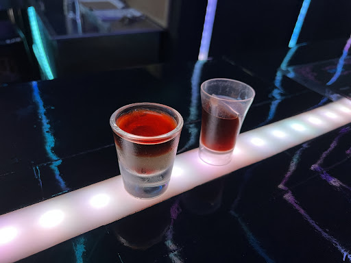 The bar itself is a total vibe, and the prices? Insanely good—only $4-$5 per shot! But these aren’t just any shots; they’re craft cocktail shots, each one uniquely colorful and beautifully presented. The glowing light strip on the bar makes them look even cooler, practically making it a legal requirement to snap a photo before drinking!