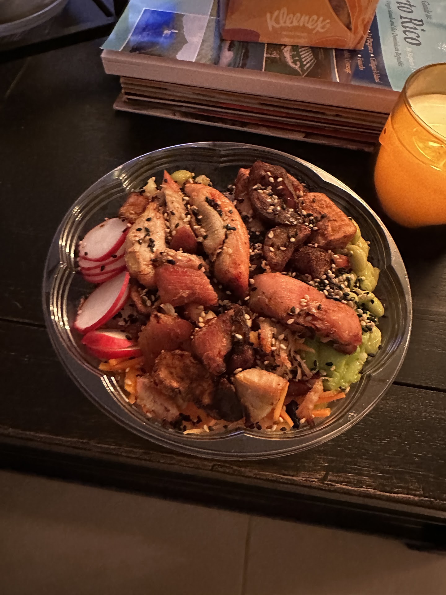 me comi el bowl de pollo y mi pareja el de mahi, ambos no sabiamos que topping añadirles pues el concepto es muy distinto al que estamos acostumbrados,