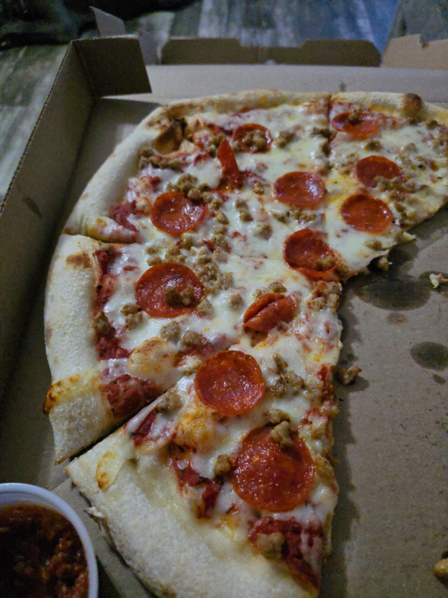 *Fresh dough *Nice crust *Old school environment *rare *I think I seen a bible when I first walked in very enlightening.... *No I was not paid to say this just stopped in out the blue... This is my opinion find something you like order it.......What we had was around 15 a pop plus tip......We did have unlimited drink refills on soda and tea....The small pizza will fill one big eater up but will fill 2 calorie counters...