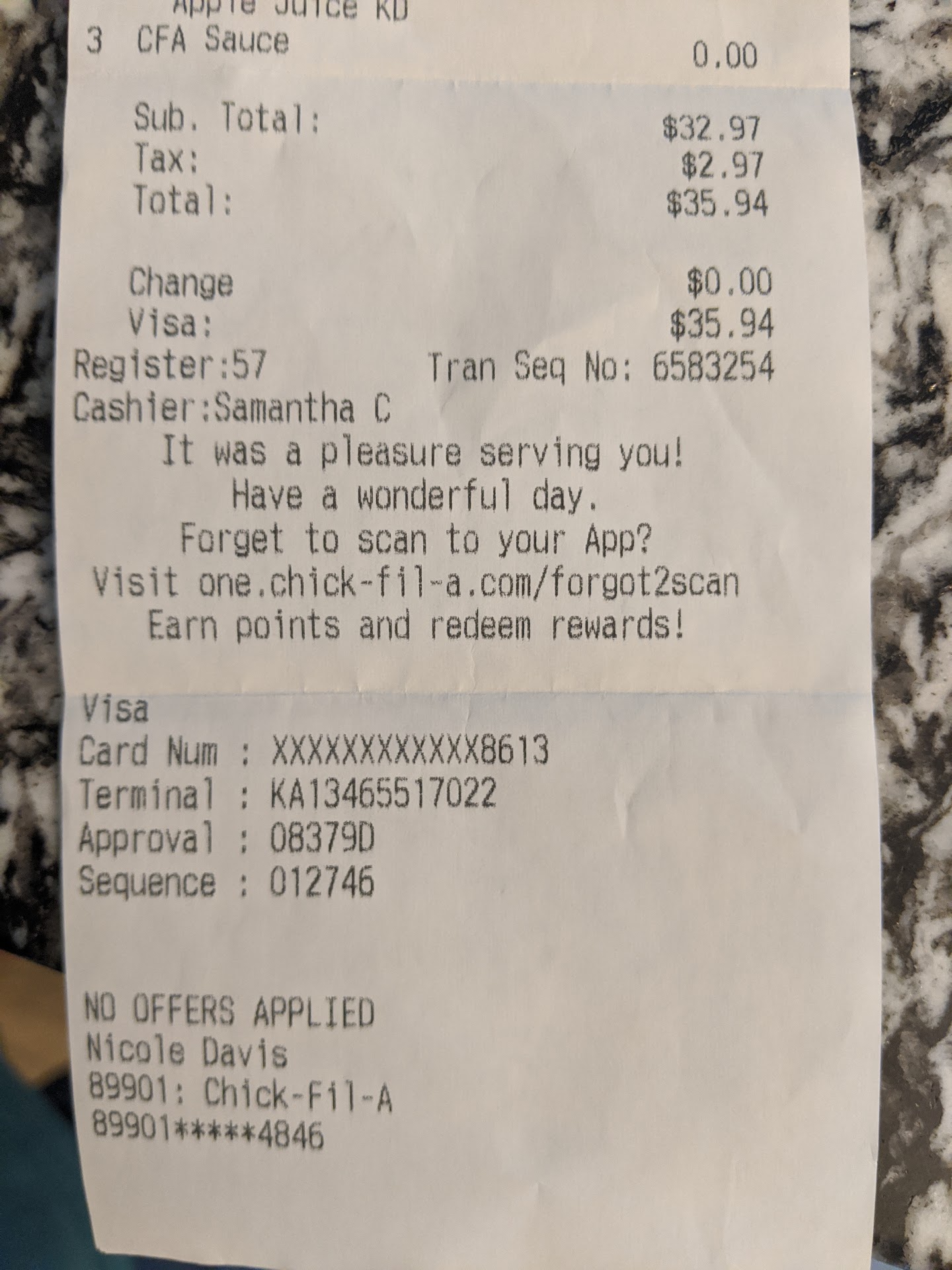 Read moreToday we had the worst visit to a Chickfla I have ever had. We were excited that the Aiken location was back open and the line was wrapped around the building but we joined the drive thru line anyway. Line was moving a bit slow but we were patient. Accidentally checked into pick up instead of drive thru but it wasn’t a problem until we got to the window, where we sat for 15 minutes. Everyone behind us kept getting food but we just sat there waiting for our food and holding up the line. We tried to talk to multiple staff to give our name and we were blown off each time. The girl at the window putting orders together finally made someone come ask our name and what we had ordered. The order staff had radioed that we were in the drive thru line so we reminded them of that also. After sitting in the drive thru line for an hour, we finally got our food. They apologized and we thanked them anyway and pulled into the Publix parking lot to eat. Our fries were cold. Kale salad did not taste good and I didn’t get a almond packet that comes with it. Iced Coffee tasted like water. Our sandwiches were okay. Overall very disappointed...