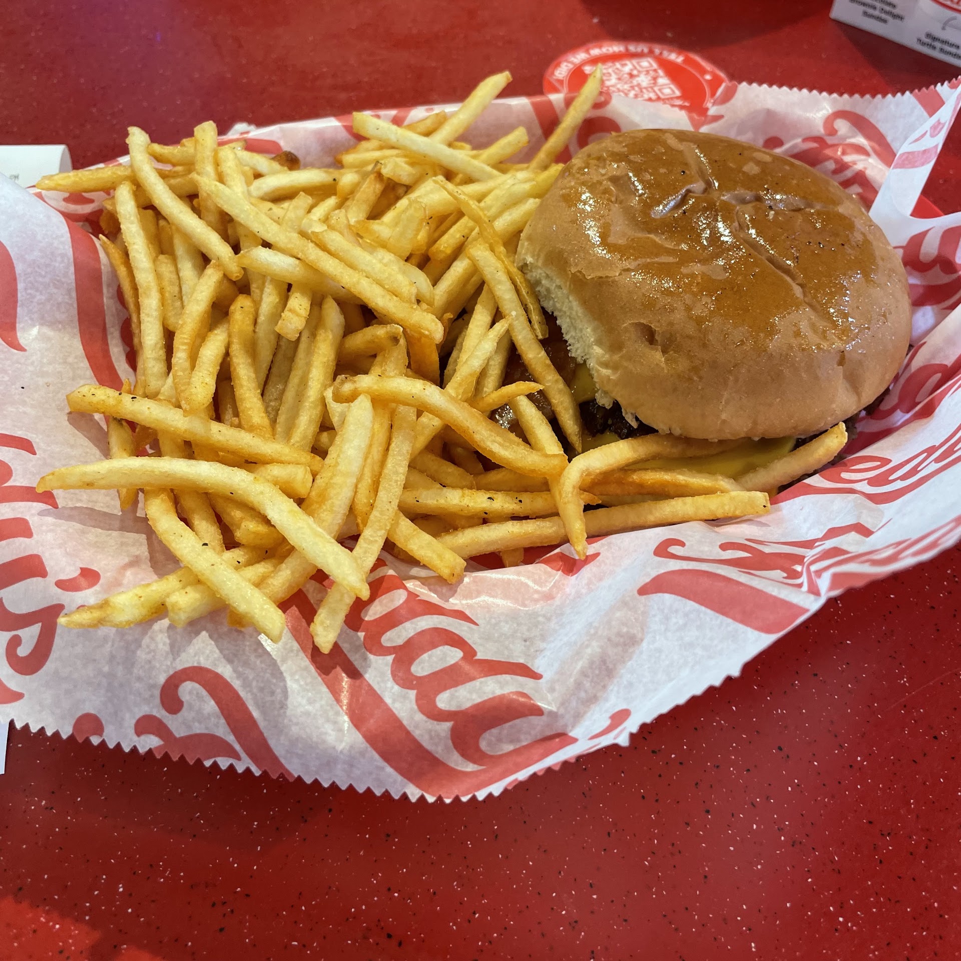 Read moreThe young lady assisting me today was great, I did the drive through so I cant speak on atmosphere. I decided to give this place a try as I'd never been to one. Unfortunately, this is probably due to inflation but I could not justify the money I paid vs what I received. I ordered a single bacon combo and paid $12.14. It came with the shoe string fries, the burger, and what they call a medium coke (its a large to me). The burger was FLAT, I guess I expected it to be more of a star of the show given the price being $11.19 for the meal. I asked for no pickles so I had a flat burger with mustard, onions, and thin microwave bacon pieces. The shoe string fries were fresh and hot so they were good. The drink was either a 24 or 32 oz so pretty big. I was going to get a scoop of custard on a cone but this was going to cost an extra $4 for a small cone so I decided against it. The food just wasnt worth the price tag.