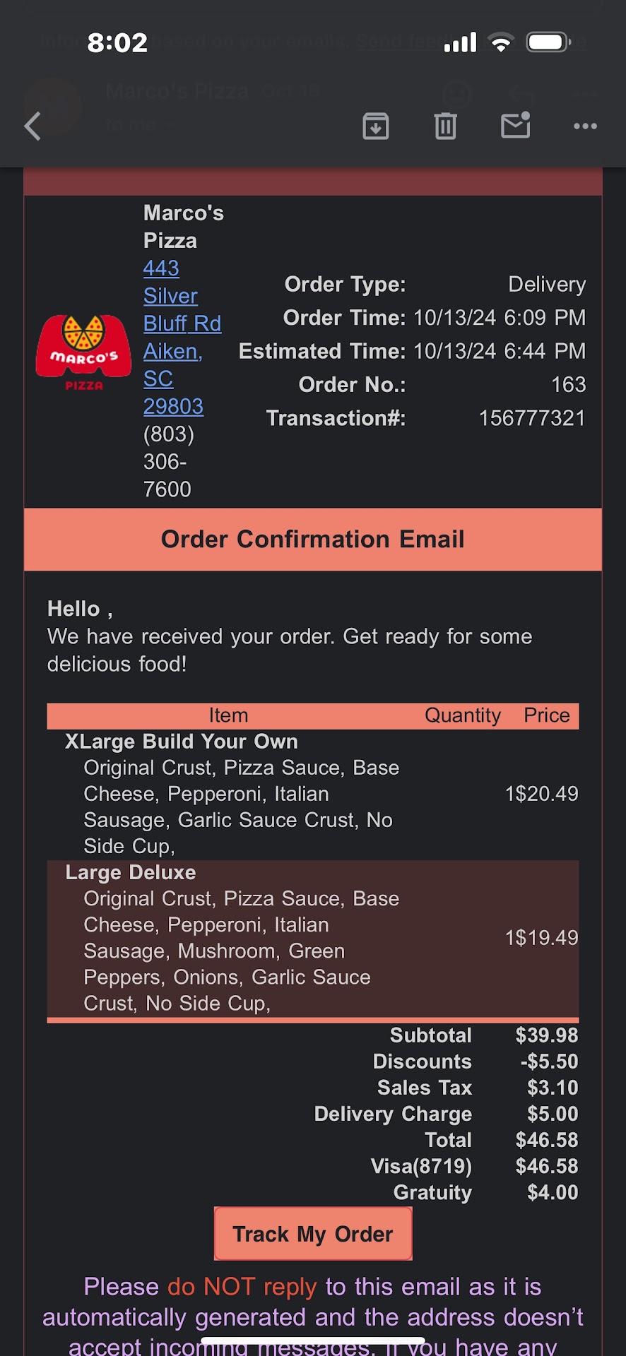 Read moreNot one to ever leave reviews but tonight will be the exception. Ordered was placed around 6:40pm on Sunday with a 30min delivery time through the Marcos app. An HOUR after being ordered, called to check on delivery time and was told someone would be at store to pick it up. Food was delivered at 8:10, minus an item. The store did not have drivers and instead DoorDash was used through the store. Not that big of an issue, however; when the store was contacted instead of taking responsibility for the missing item, correcting the issue or even refunding the money: