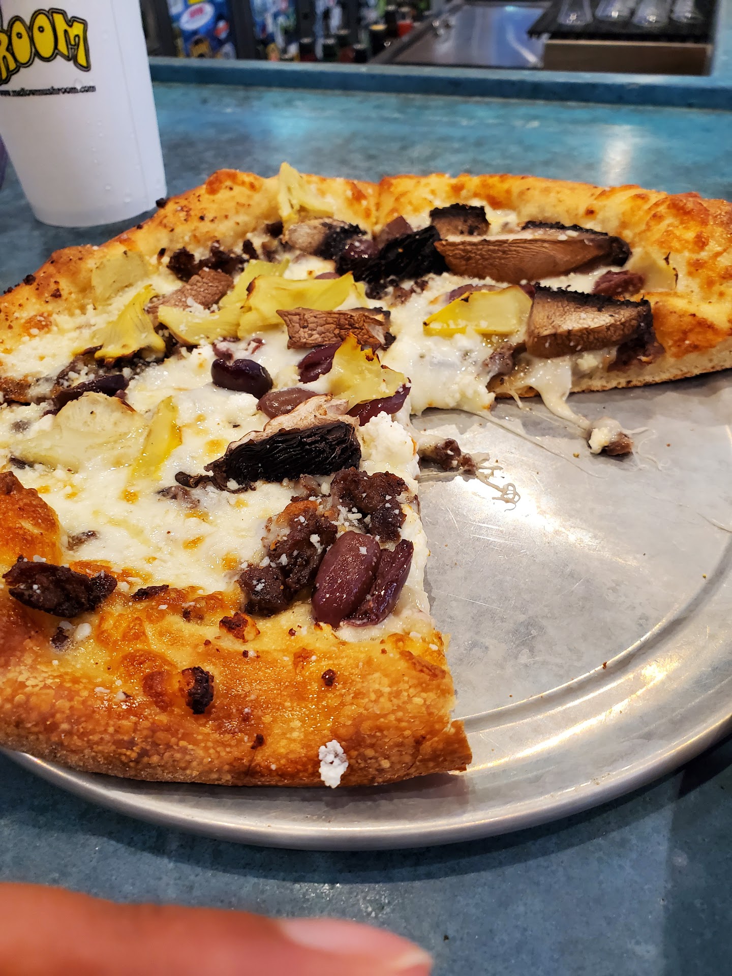 Outside/decor: Mellow Mushroom in Aiken is located in part of downtown called the Alley. The city has restricted vehicle access and encouraged pedestrians in this part of downtown so you will have to park farther away from the restaurant. Parking is limited to on-street parking in downtown, so at peak hours it can be harder to find. Mellow Mushroom is generally known as more of a stoner decor that is reminiscent of the 60's and 70's and this location is no different. Lots of colors on the walls and various mushroom decor makes for a very funky vibe. Despite being a rather large restaurant, it is quite popular so, there is frequently a wait on the weekends.
