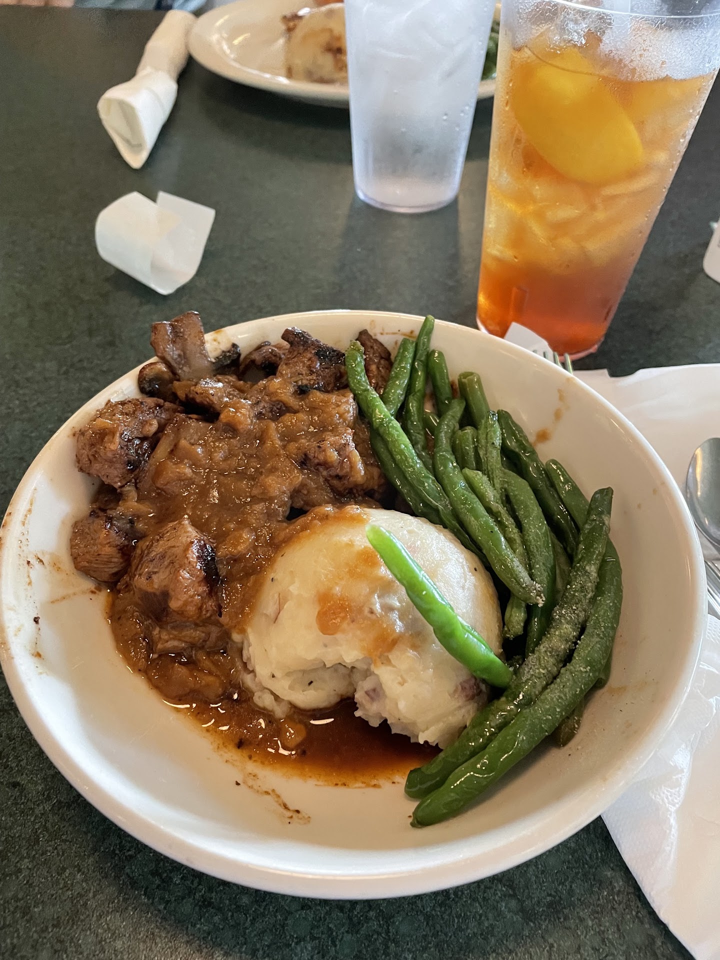 Read moreI’ve tried so hard to like this place but it’s a struggle. So inconsistent. The server was friendly but our drinks ran dry & finally we had to flag another server down to get ours to come to the table. I ordered beef tips. I was surprised and not at all thrilled to get my tips, potatoes and beans in a bowl. First off I’m not a fan of my food being squished together nor do I care for gravy on my beans. The food was good but our party of 4 was a bit taken back by the serving sizes. By no means did any of feel like we had dinner portions except the one who ordered a standard chicken sandwich. Heck he had more fries alone than I had food period. Our meals didn’t come with any type of bread/rolls etc and when we inquired we were offered toast or biscuits for an additional charge. This has never happened before. We got the biscuits and I commented that they looked DONE. Someone at the table took a fork to split his and add butter - only the fork couldn’t split the biscuit. I’m not exaggerating- it was that hard. We sent them back and ate without any. I might add we were not offered anything else either. It’s also a lost opportunity for a restaurant that doesn’t try to up sale dessert…. I mean after we were still...