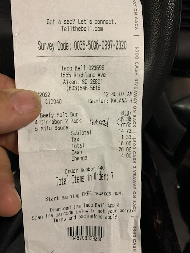 Read moreWent by The North side Taco bell for a midnight lunch snack since I was working. The drive through window girl was courteous enough. I order a few burritos and some cinnabon bits. I ordered a 12 pack to snack on until 6am and I was told they were out of them. Full menu until 0100 and this was 0041. She then tells me she has 8 left. I pull over to another parking lot to eat and shortly notice all of the things I ordered were not included in the bag. I head back over to get my 8 cinnabons that weren't included in the bag and the manager asked where they went. The courteous drive through girl speaks up giggling saying we ate them. Mind you the store is still open. The manager then asked what I wanted to do.... Either a refund or come back tomorrow for the cinnabons? I told him a refund and he counts out the refund for just their mistake and then asked me to sign the receipt because they messed up and he was having to do a refund. I then educated him on what he should be doing besides refunding their mistake, but the whole order. I definitely wouldn't have spent 15 minutes blasting the Taco bell on Google maps about an easy fix. I will let you know that when I go back to this Taco bell I will check the bag before leaving their drive...