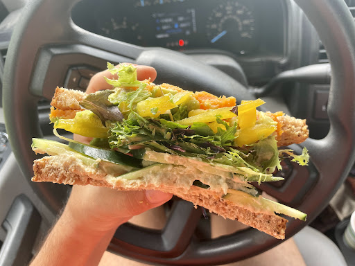 I ordered the “Happiness” sandwich on 12 grain bread with cucumber, zucchini, spinach, avocado, humus and mashed sweet potato spread. Plus, a cup of fresh carrot apple juice.