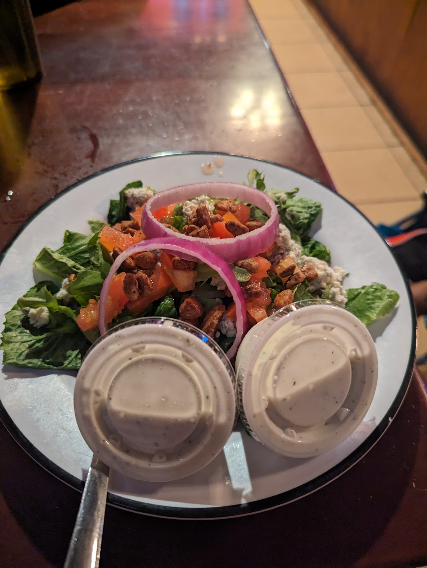 We ordered a wing chip appetizer with some toppings on it, including some Buffalo sauce (mostly tangy). They were good, but very slightly overcooked. Not a huge deal, we still devoured them.