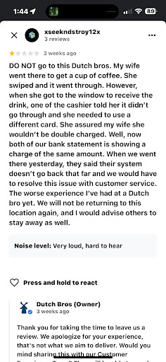 I told them that they double charged my card where they told me they didn’t. When I get home I see the 2 charges. I contacted Dutch support and they told me they would forward my message to another team, leaving the issue not resolved. We will no longer support Dutch because this isn’t the first time we’ve had this issue at the locations in airway heights and Spokane area. Now I am going through the process of disputing charges with my bank due to their lack of resolution and response. Sharing the review below that I’m referring to since my situation happened today, Aug 23rd, 3 weeks after this review! Last time this happened to us was last Feb, I stopped going to Dutch because of this. Then went because it was my birthday. Beware of this location since it seems to...
