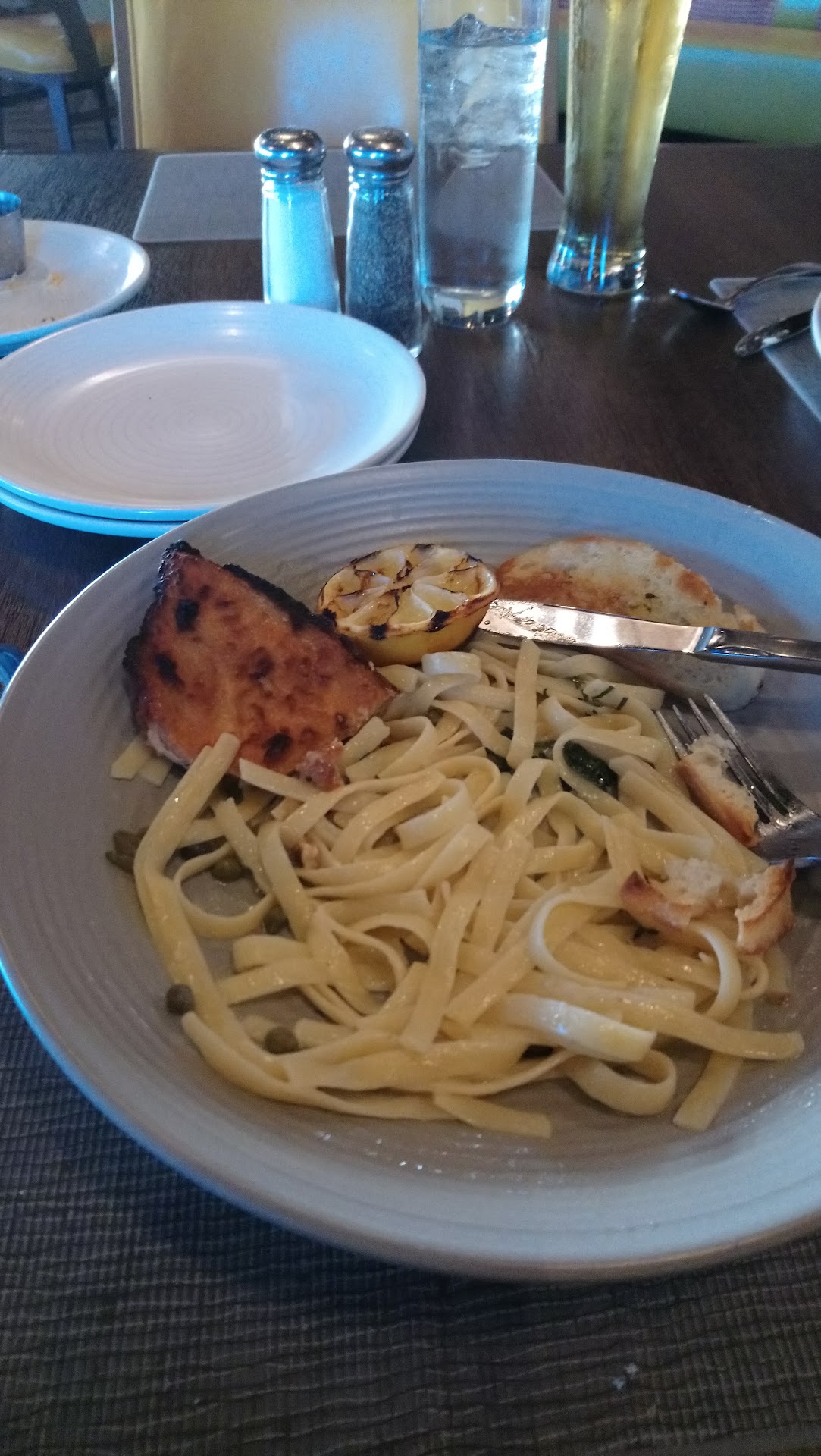 I ate here with my mother last night (5/11/18) and I ordered the Lemon Chicken Piccata, and my mom ordered the seafood platter. Her food was mediocre at best, but my was just plain awful. My chicken was super overcooked, to the point it was almost like jerky. The server came back to ask how things were, and I pointed to the chicken (it even looked like a dry piece of leather with burnt edges) I told her it was very bad, she apologized and said she would have them make me another one. I really didn't want another one at this point because I didn't want to wait, but agreed to it anyway.