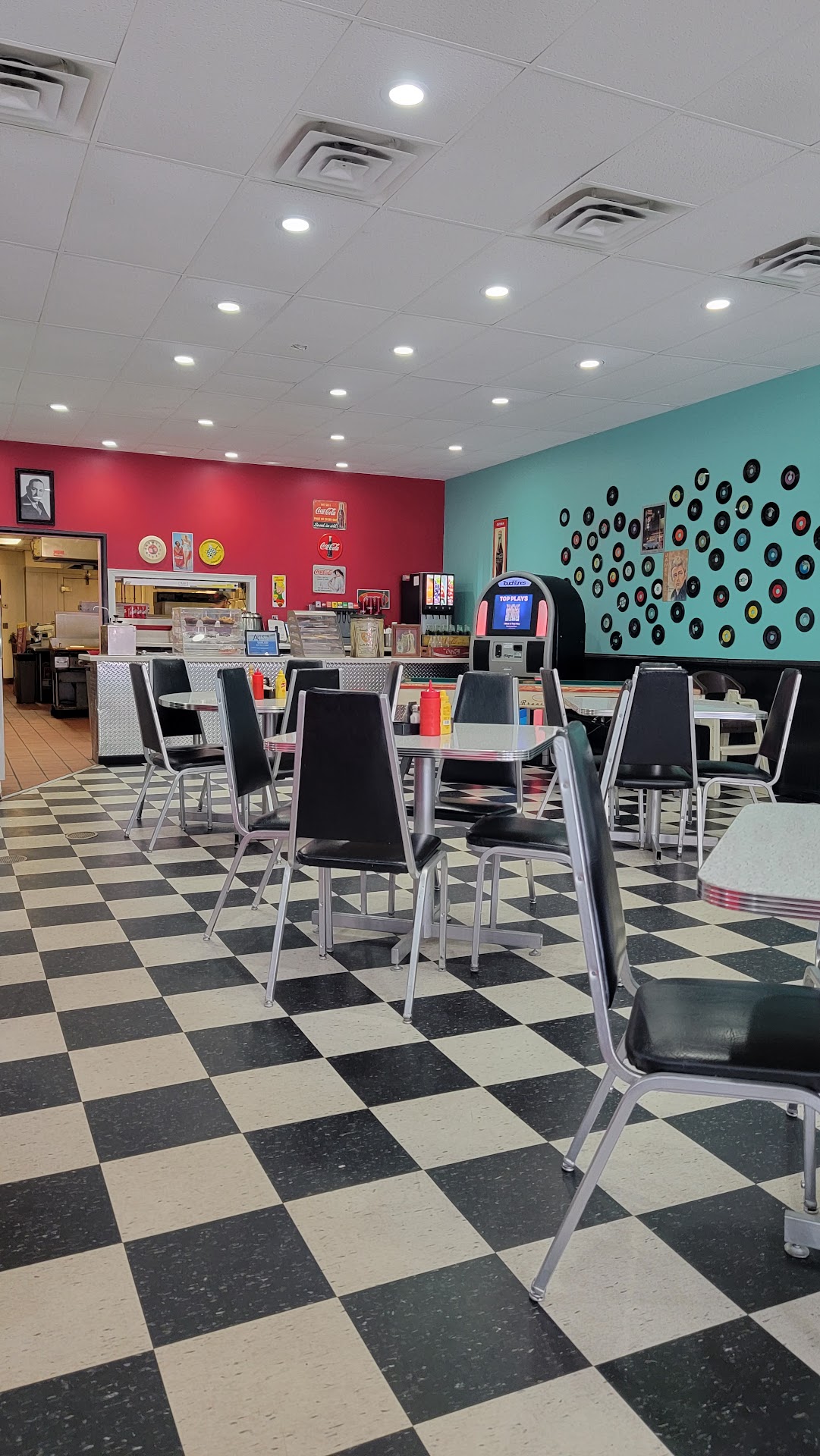 The atmosphere is what you expect from a 50s diner, great decor, roomy booths for bigger men like myself, I even played some songs on the jukebox!