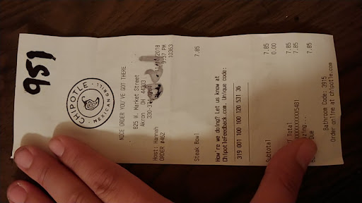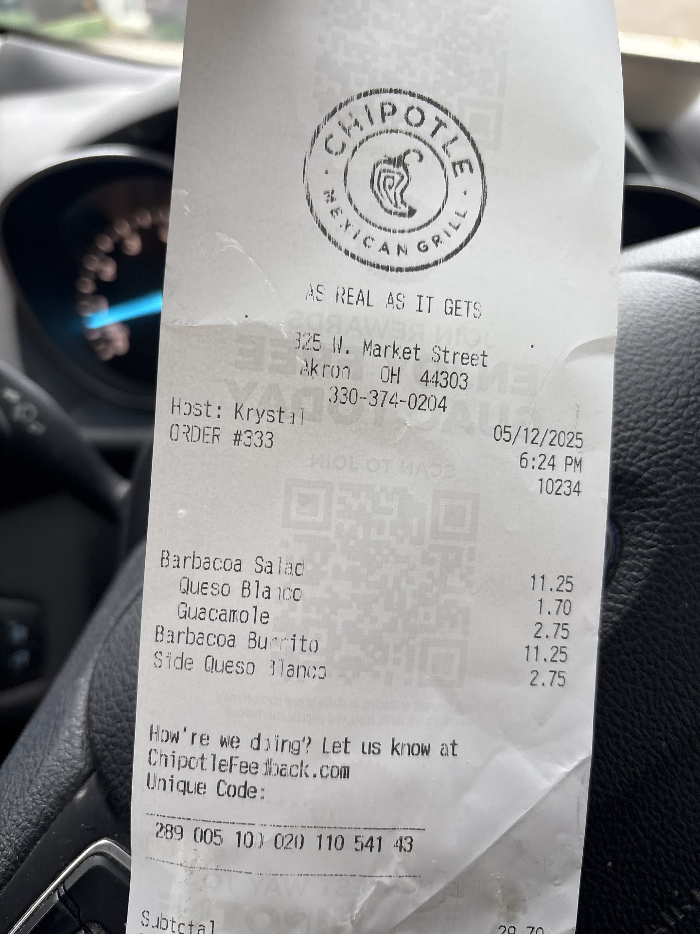 Read moreSo last evening(7:15-ish), I went to get my fiance and I sofritas and carnitas bowls because Akron couldn't seem to keep the electric on in the Highland Square area, AGAIN. Anyways, they had a line out the door. I was a cook for 25 years, 2.5 of that at a Chipotle location. The staff here, though young, was focused and constant and did an amazing and extremely professional job. One customer, and you know who you are, was very rude to the cashier who was helping to make an order, switch out pans to bring fresh food out, helping the 1 and only young lady making all the orders.(and to the young lady making the online orders - wow and great job!!!) So to the cashier, good job, thank you, and you should be proud of yourself. The rest of the staff was very solid - though VERY busy - and not expecting that many orders, I'm sure, were calm, polite, and smooth. So, props to y'all too! You see folks, if you've never worked in the food business, you don't get it. It takes a certain type of person to do what they do-so don't be rude because you think you're above them. Remember, us food workers worked every day during the height of the pandemic, were forced to police masks, risk getting sick, and forced to listen to the absurdity and rudeness of people whom think they're privileged, above others, or just plain inconsiderate. As for the rude customer last evening at about 7:30 pm; what if that was your son or daughter working? Hmm? I sure hope you don't talk to your kids, parents, spouse, or...