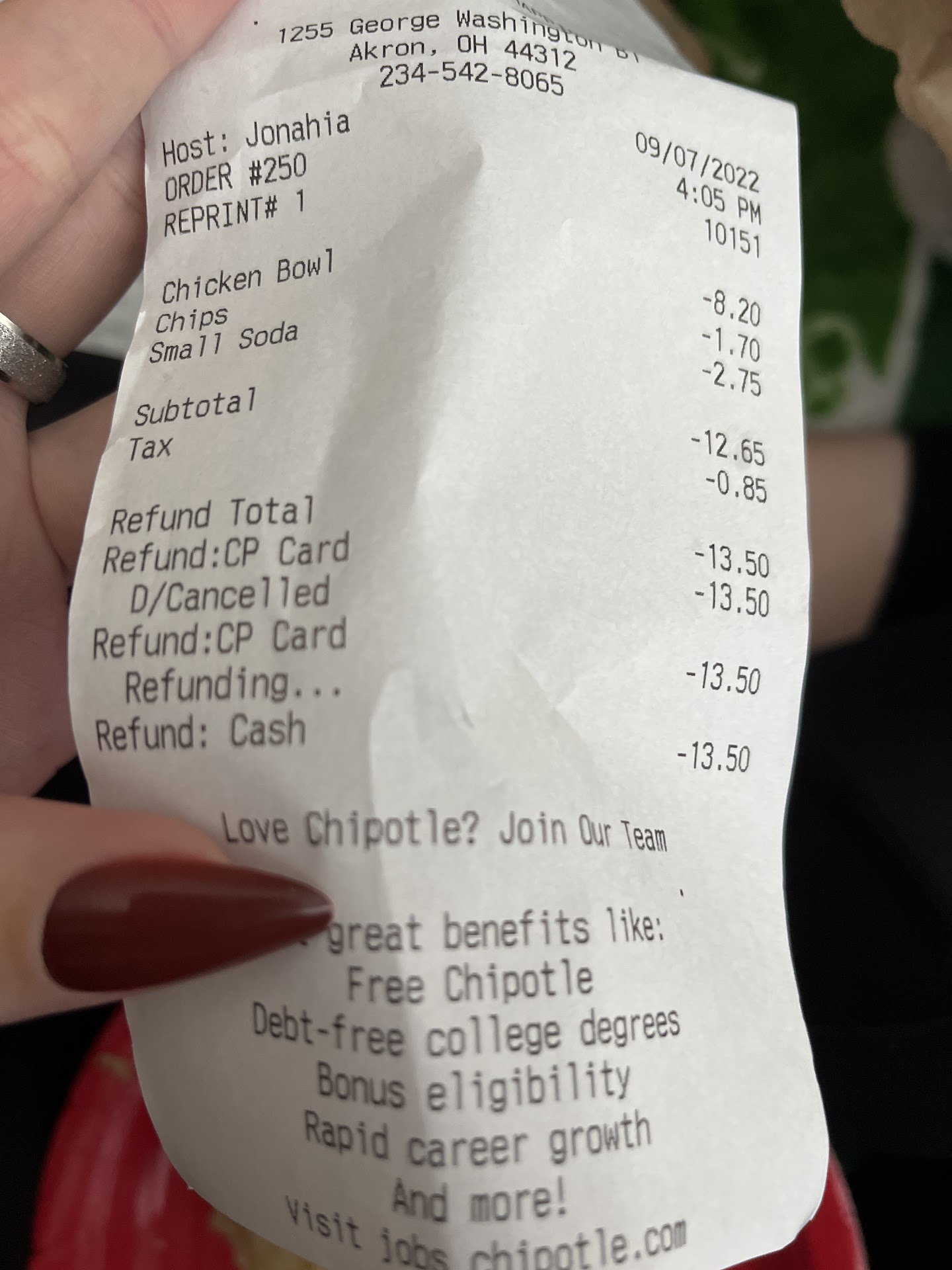 Read moreAbsolutely the worst chipotle I’ve ever been to without a doubt. If you go in person it’s not too bad but your stuff is still cold and you have to ask for extra everything to get a normal amount and some of the employees have attitude. The biggest issue is online, everywhere isn’t as good online as in person but this location is a nightmare. on multiple occasions I’ve had queso spill in the bag and onto my car seat this time was just horrible it was all over and the bag was half busted open on the side that the lady handed it to me by and I couldn’t see it till I was gone there is zero chance she couldn’t see it. Even if you put extra everything there’s still barely anything these people have no accountability or integrity when your not there watching them make your food it’s unbelievable, I have NEVER gotten snippy at service employees because most the time they don’t deserve it but these people are unapologetic and are not held accountable it’s just common sense a lot of the time like if you place the queso normally instead of just yeating it in the bag like they always do this wouldn’t happen. The manager, I can’t understand a thing she’s saying cause of her accent and I grew up around people with accents. AVOID. Honestly can’t believe it even has 3 stars that’s why I’m giving it a review. Just pay attention and don’t be a mindless drone while working that’s what it...