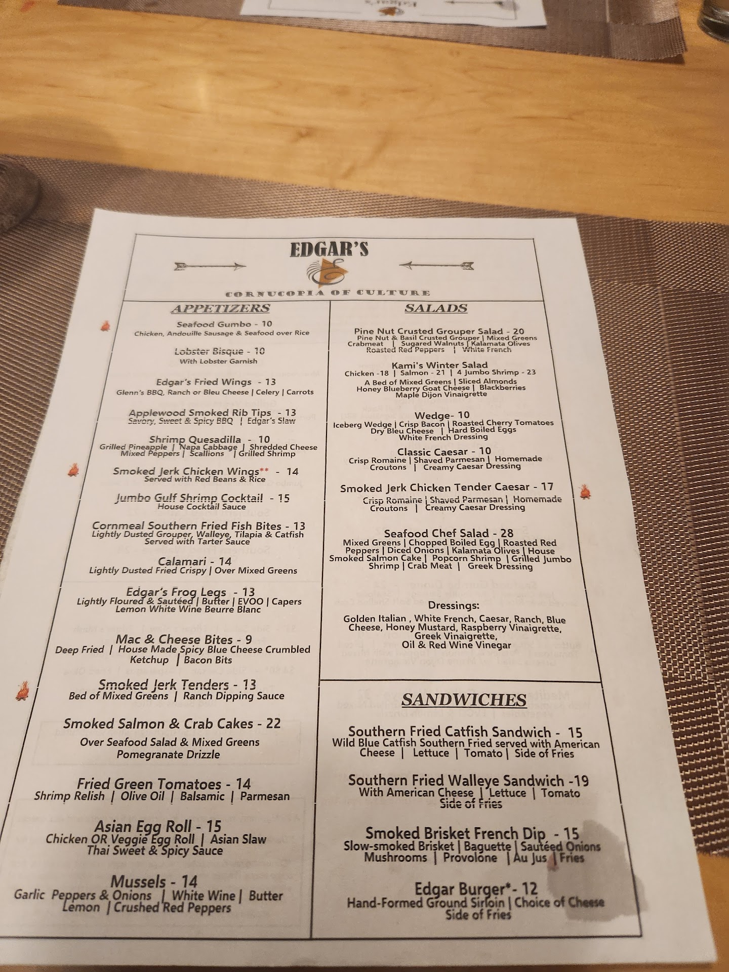 Read moreDisappointing. Restaurant opened at 5, bar opened at 4 when we arrived. My wife and I sat at the bar to have a cocktail where we endured an employee vacuuming the floor AFTER the bar had opened, completely oblivious to the fact customers were present. Hint: GET YOUR CLEANING DONE BEFORE THE DOORS OPEN! This wasnât the pleasant experience we were hoping for and simply very tacky. A busboy came to our table to remove plates but was holding a large styrofoam cup with a straw that he was drinking from as he asked if he could take our plates. We said âyesâ and he proceeded to put his own styrofoam cup on the bar, where customers were sitting, then came back a few minutes later to get it. Glen Gillespie â get someone to manage the front of the house who can bring some order and discipline to your operation for the benefit of your patrons and add some class to the atmosphere. We get it â you spend a great deal of focus on the food - which we usually enjoy. But we wonât be back for a while after our latest experience, which to us demonstrated youâve lost track of the full customer experience in the front of the house. A bartender working in a tee shirt isnât bringing the caliber of leadership you need in the front of the house to improve the experience for your patrons. Weâre rooting for you but please address these shortcomings. Thereâs a lot of competition for our dining dollars and we simply wonât go to places that provide a mediocre experience. Friends ask about our experiences at Edgarâs and...