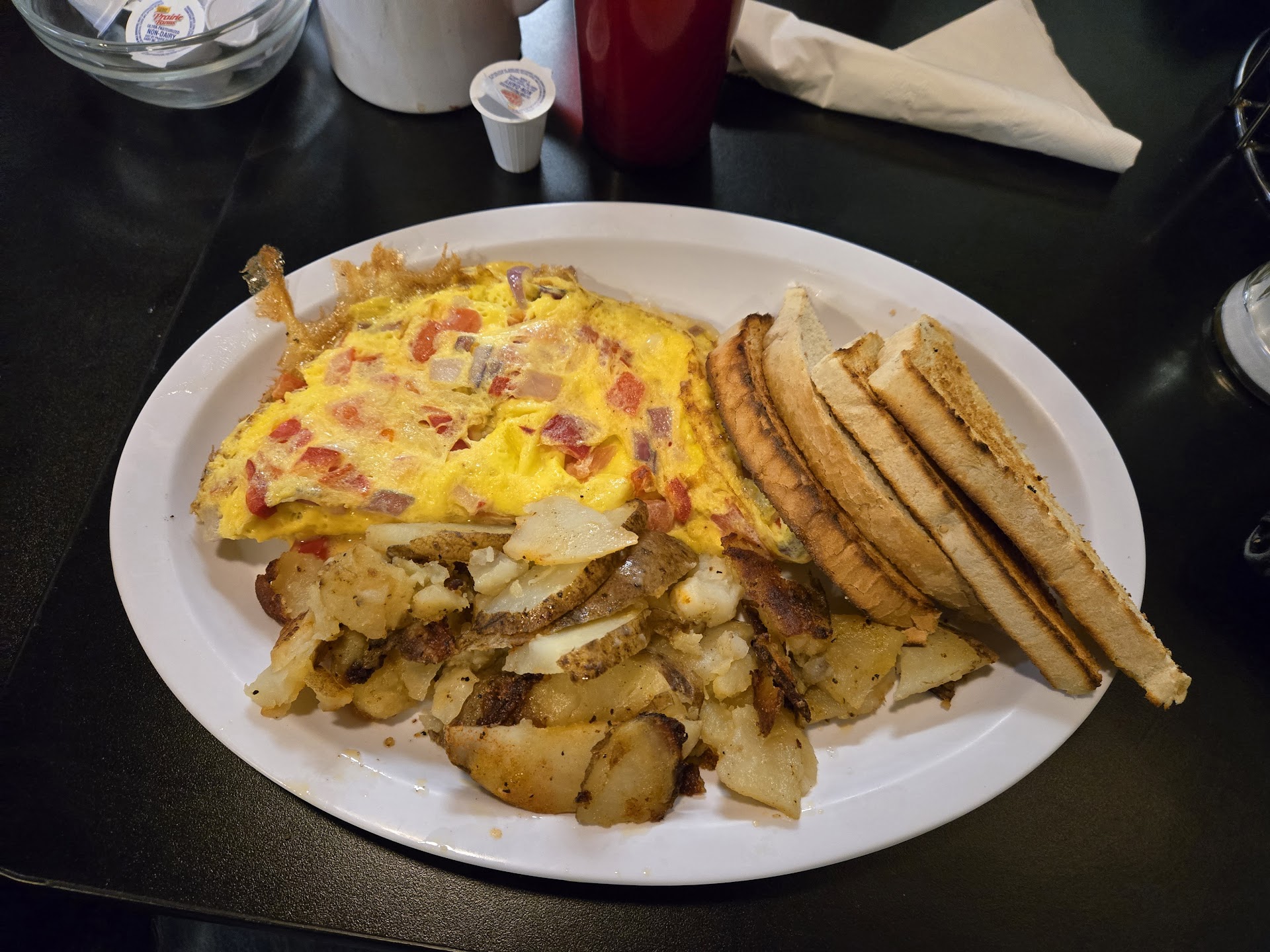 Read moreMy wife and I decided to visit this spot for the first time on a Sunday (day before Valentine's Day) at around 11 am. We were seated quickly. Not the cleanest place, as others have said, but nothing egregious. Mimosa was delicious, coffee was standard fare but good. If you like being warm while you eat, maybe wait until a table opens up towards the back of the restaurant, because it gets chilly when patrons open that front door and that blast of winter air hits your legs. We left our coats on the whole time as did many others. Owner should consider installing an air curtain to fix this. Case in point, when I looked at their thermostat, it was set at 81, but showed a cool room temp of 69 degrees. Food took a while to arrive, but they were pretty busy. Our server was nice and did a good job. My wife's EO Breakfast Bowl with ham was good, with big pieces of potatoes that made for a fairly large portion. My Red Eye Hash included their delicious corned beef and spicy, but smaller portion of potatoes with green chiles. I'm a spicy foods fan, so, to me, the EO Bowl needed hot sauce (they had Tabasco and Cholula on the table - nice), but the hash was perfection as-is. We ended up ordering the blueberry pancakes to share at the end. They were nothing special, and the regular syrup that accompanied them did not come heated up. There is an option to choose real maple syrup for an upcharge. A warm, clean dining room and some warm syrup with less waiting would have made this a five star review. That said, we would definitely go again, and, as much as I'd like to try something new, the hash is probably what I'll be ordering. It...