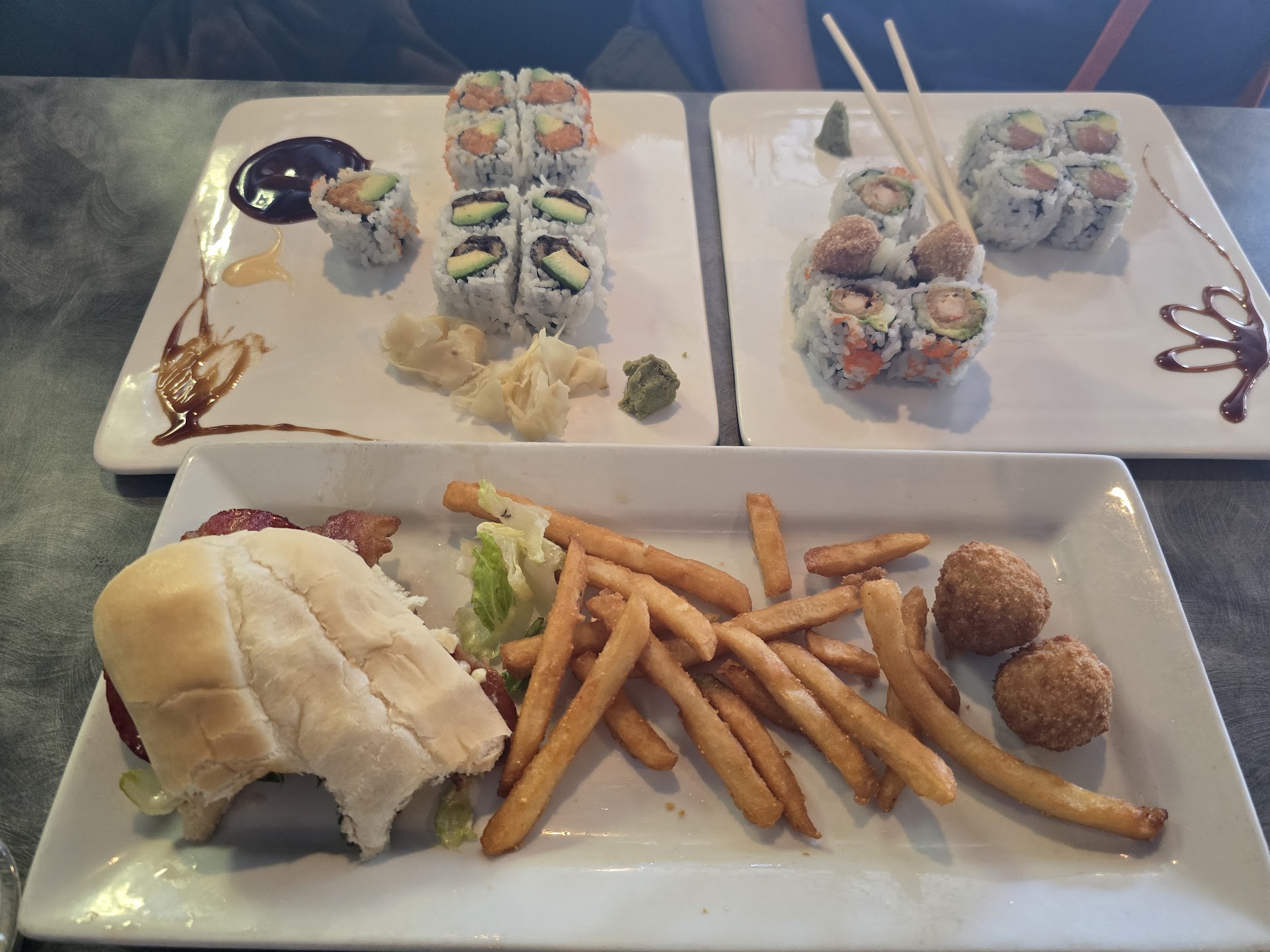 Read moreBest sushi and fried sushi around. Service is not always the greatest. This is more of a bar than a restaurant and I wouldn't bring children tbh. One star deducted because my order has never once been completed on time and the other star for cleanliness. Honestly, the cleanliness makes me question if I really want to continue eating this sushi. The pick-up counter is covered in Lord knows what, everything is covered in dust and dirt, massive stains on the walls and ceiling, and wires coming out of everywhere.