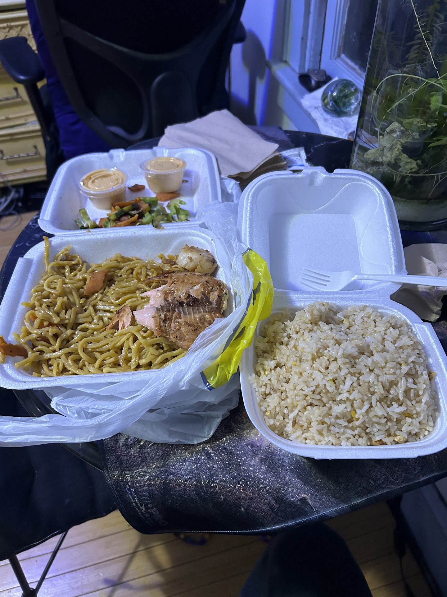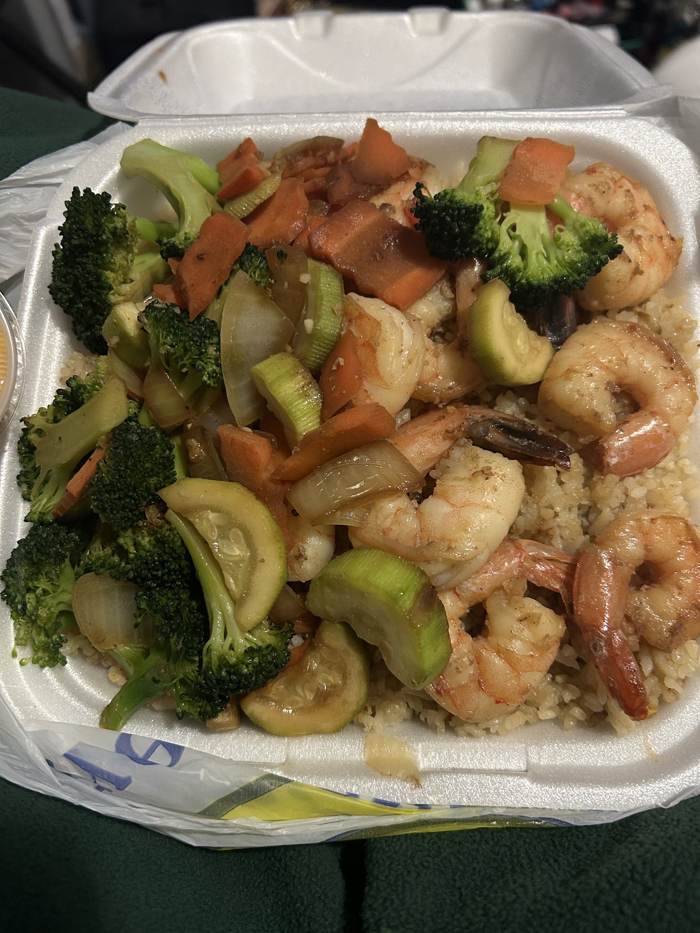 This place is nasty. The 5 star Asian places in Akron are the worst! I mean literally just look at the photo. This was supposed to be scallop and salmon with a side of fried rice. There’s literally no teriyaki or soy sauce in either. The noodles and rice are whiter than my pale a$$. I got 3 scallops.. The vegetables and rice are very low quality. The rice seems hard.