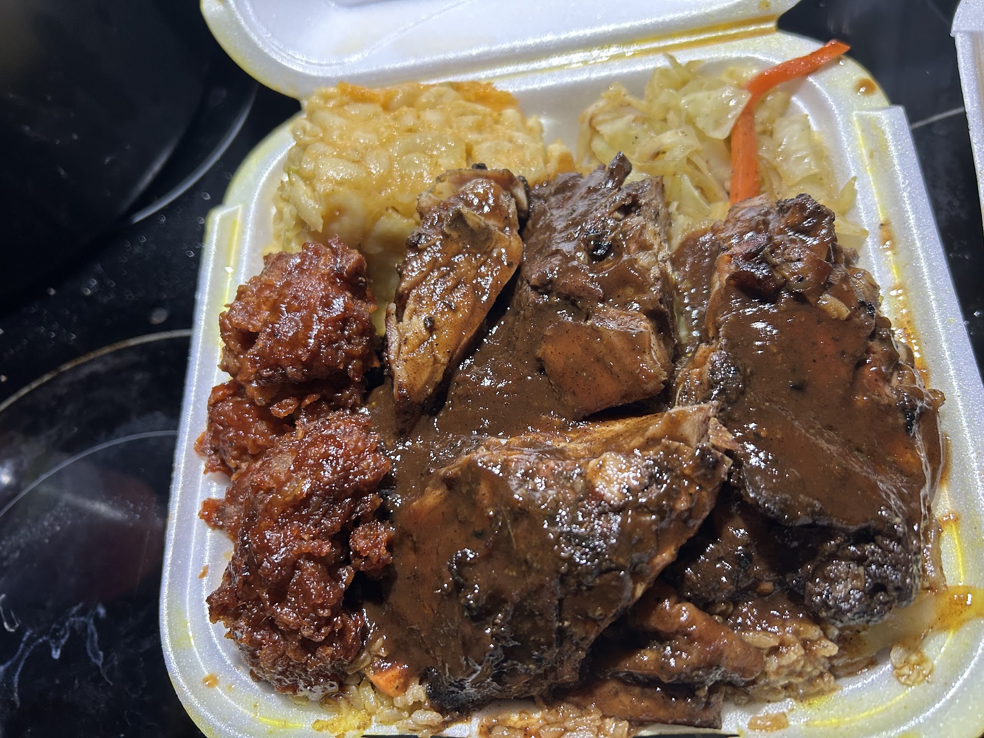 Where to begin?? The food is beyond amazing!! My boyfriend and I tried this place for the first time last night and I only have great things to say. We were greeted with kindness and enthusiasm from the man and woman working there. We let them know it was our first time and we didnāt know what to get, and the guy gave us some samples of the food to try. I tried the curry goat, curry chicken and both were superb. Tender and flavorful. Ultimately I decided on a large jerk chicken plate, white rice with the curry gravy, cabbage, baked Mac and cheese and got a side of fried plantains. My bf got the same thing but also had the bbq baked chicken, and he had the jerk fried rice instead of white. Both large combos, and we got 2 desserts ( cheesecake and pineapple cake) and 2 drinks. We spent about $50 for everything. And EVERYTHING was Amazing. Not just the best Jamaican restaurant Iāve been to, but simple just some of the best food Iāve had period. You can tell the food was made with love, seasoning and a whole lot of respect. We will be back! And yes you should go. We were so grateful that we decided to check out this local place instead of going to one of our regular spots. Weāre trying to be more intentional with where we spend our hard earned dollars. We could have easily spent the same amount else where and wouldnāt have gotten the same personal experience, the super large portions, nor the experience of simple trying something new.