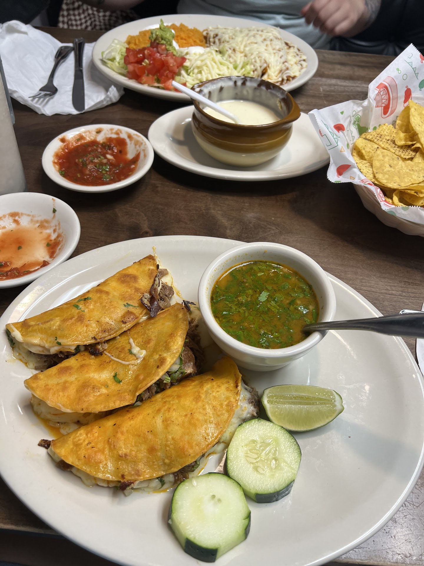 We ordered chips and cheese chorizo dip, and chips and guacamole dip. After half an hour and watching all the people who came on after get their cops and dip, I started to get concerned. The lady who was bringing everyone their chips and salsa kept coming asking people who ordered cops and dip. I Kelli telling her we did. She was getting pissed at me. After the third person who came in after us got there appetizers, she asked what we ordered. I told her and she seemed very inconvenienced by us.