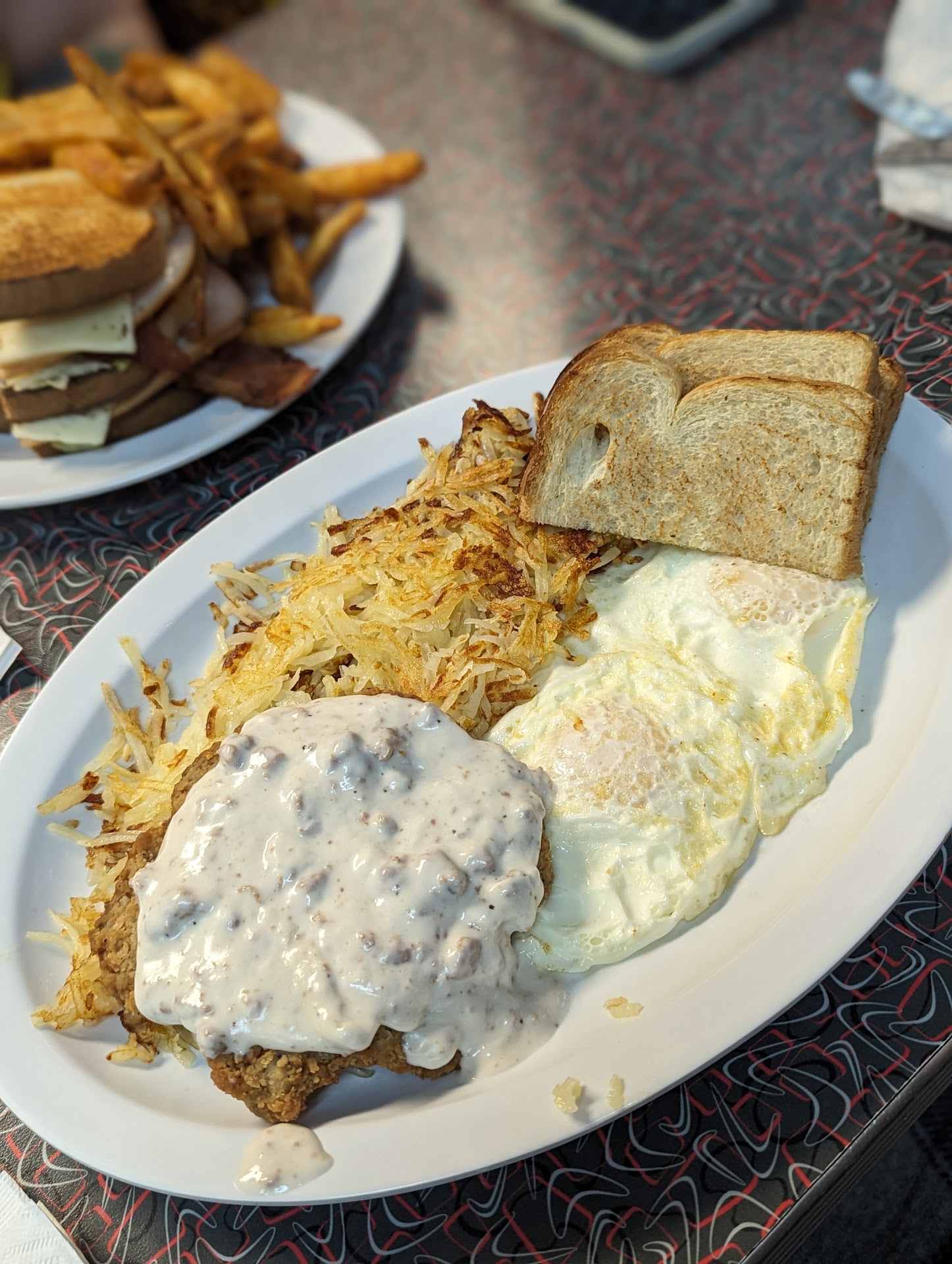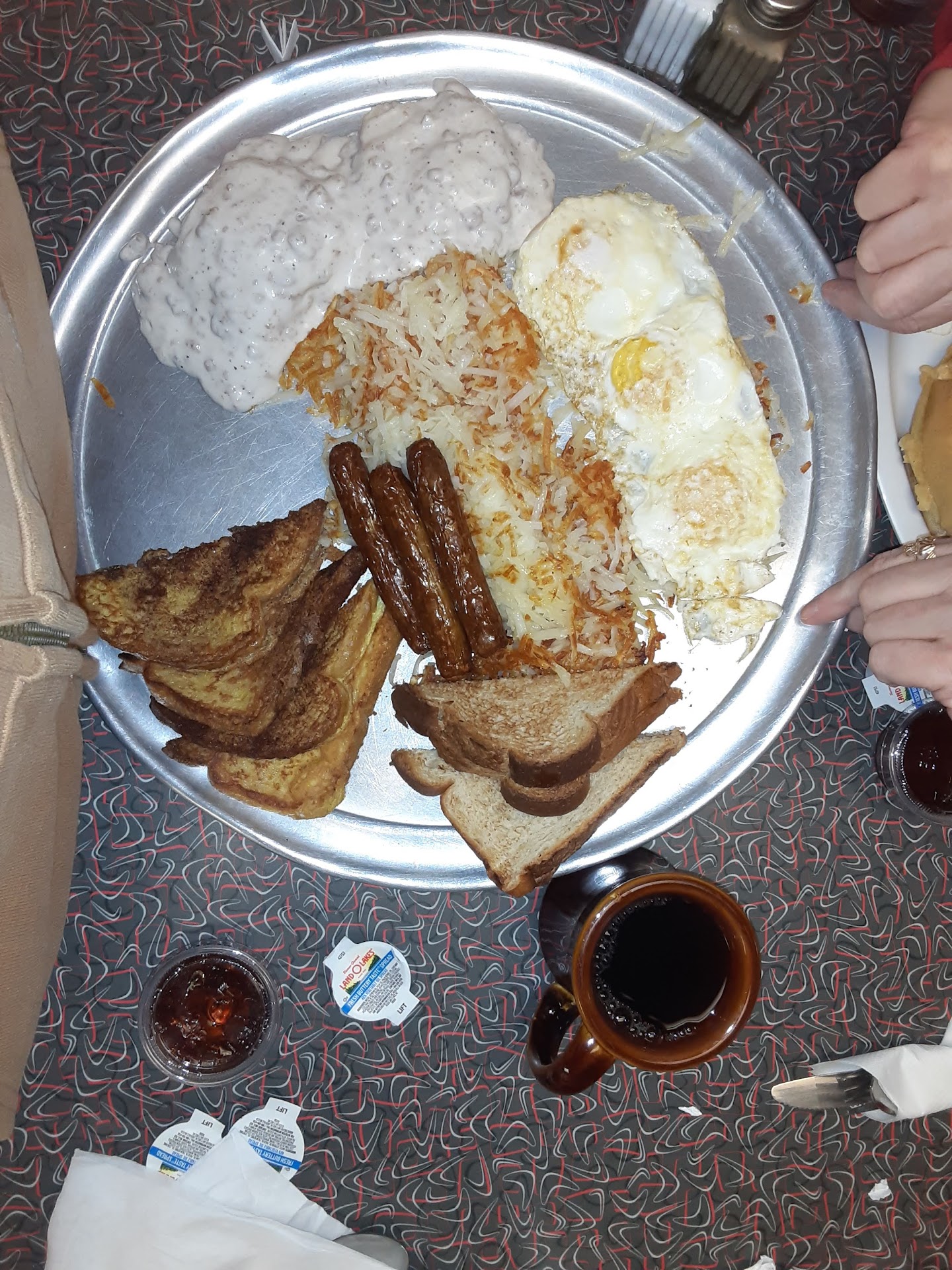 My French Toast was cold, the butter didn't melt, and the syrup was runny, like water. The sausage patties were freezer burnt and had lil squares in the middle of less cooked meat. I still ate most of it bc "waste not want not." 🙃 The sausage gravy was bland, but hot... unlike everything else we ordered.