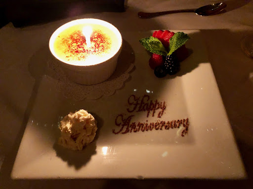 My wife and I were staying in B-ham overnight. We decided that we wanted to go someplace "nice" or "romantic" for dinner since it would be a make-up for a missed anniversary dinner. The restaurant is very unassuming on the outside. I mean, it's kind of in this business strip that is a step above your average strip mall. Once inside however, the atmosphere took us by surprise. Low-level lights, lit candles at each table and in wall sconces, and a well-polished bar top. We were seated at an intimate table, not on top of anyone else. Which in these COVID-19 times, is great. I want to take a moment to address some of the other reviews on this topic. Before we visited Amore, I did read a few reviews that ripped the restaurant for not providing adequate space. I am here to tell you to ignore those reviews. That was not an issue for me or anyone else there. All of the staff were also wearing masks and gloves. No complaints from us on that score. Anyway... Steven was our waiter and was he fantastic. Dude is top-notch. Very polite, professional and had a great attitude. He was able to recite the day's specials in a detailed manner that communicated a real interest in the food that was being prepared. My wife ordered the eggplant parmigiana and I ordered one of the day's specials with the grouper (can't remember the exact name, sorry). Steven was able to recommend some wines to pair with our dishes and we took him up on those. And I'm glad we did! Excellent choices, Steven, thank you. Both dishes and accompanying salads were excellent. The garlic knots served with a dish of olive oil and seasonings were superb. I could go on at length about the food, but this review is already getting too long. Just trust me; it was outstanding. One last thing I would like to add. At one point while talking to Steven, it came up that our anniversary had passed recently. I did not think much of it at the time, but after our dishes had been taken away, Steven appeared with a plate with a dish of Vanilla Crème Brûlée with "Happy Anniversary" written on it. So unexpected and kind! I've included a picture of it here. Anyway, if you have made it this far through the review, all I have left to say is: If you are looking for a nice, romantic dinner with your significant other that provides a great atmosphere, top-notch service, and excellent food, you need to try this place. Get a...