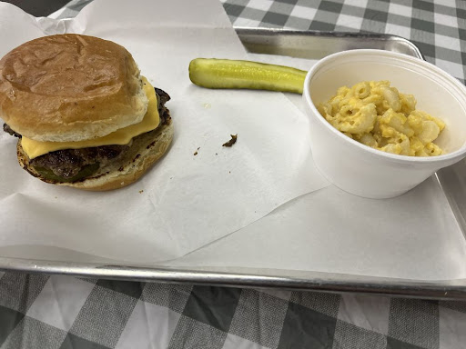 I arrived and took a few minutes to look at the menu. I am, admittedly, freakishly obnoxious and snobby about barbeque and was determined to have a positive experience, so I decided not to play with fire that day and instead decided to order one of their burgers, which I'd seen a few people rave about online. I selected their hatch green chili cheeseburger and placed an order for that. It comes with one side and I decided on macaroni and cheese. They have bottled drinks available next to the register and so I grabbed a water out of the cooler to round things out.