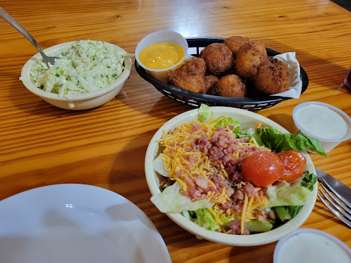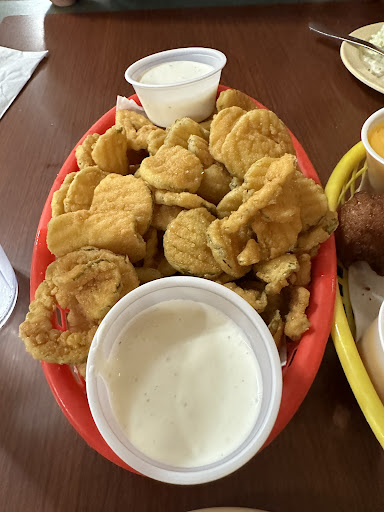 Read moreThis place and another place within a 30 mile range: are eerily similar to one another. They give you the same app (hush puppies with cheese) and offer many of the same dishes. It is also is decorated similar. However, the grease was old. Our fried pickle appetizer - disappointing. The seafood platter was all cooked in the same grease as the pickles and burnt hush puppies. I don’t know if the fried pickle are house made; they do not taste house made. The food was saturated with grease. This place also rivals the movie “Grease.” The catfish filets were small and did not have a pleasant taste.If you are used to quality seafood, you might want to skip this establishment. If you love a fresh taste and hate burnt flour, don’t come here. If you want to make your step parents upset- bring them here. We went in during a slow time- and the person handling the money was also handling the cakes. It’s just something about where money and credit cards have been, and handling food. The service was decent. It was not great nor war is deplorable. There were a couple of things (lemons) that took about five minutes...