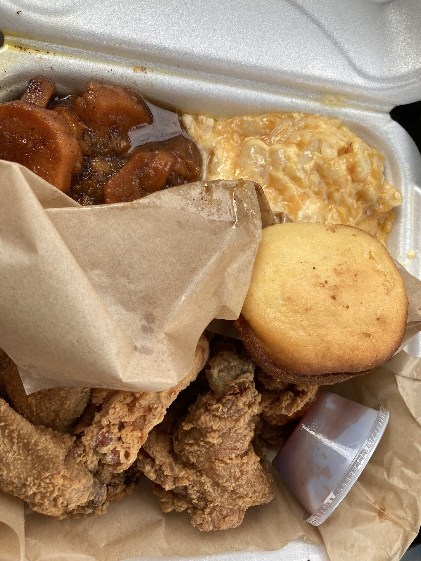 I heard about this place from my church members. They raved about how good the food was here. I was not disappointed. The only take away I can think of is the wait time. I got to the counter to order at 1:33 and didn’t get my food for like 45 min. The food was worth it however. I got the $13 Sunday Only special. I requested the fried chicken wings, candied yams, and Mac and cheese. The wings were a very good size and the batter was very good and seasoned. The candied yams were sweet and tender, and the Mac and cheese was very creamy with lots of cheese. I will definitely come back. This place needs more advertising. I would not have heard about it if it wasn’t for church members talking about it. Maybe church bulletins sent out would be great for business. Good food. This is a take out only restaurant. Order...