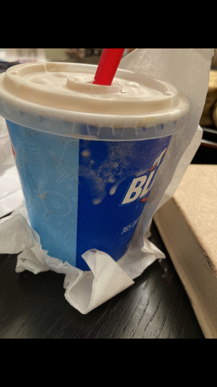 In the past, store associates would scrape the blizzard top, and force the flat top on. This causes more spillage to cup. In addition, the associates would not wipe cup afterwards. Therefore, to remedy this, I request a sundae top. I have never complained and remained a faithful customer. However, that is no longer the case. I hope additional training is offered to your drive thru staff, and a crucial conversation is had with the manager. I am sure she is a good mgr, and has the potential to be great...