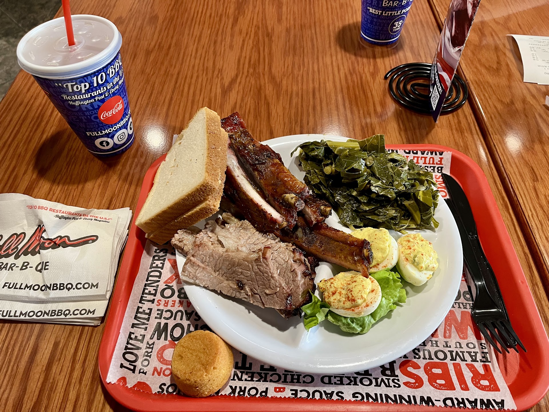 Read moreFull moon is my go-to BBQ. The chopped pork is piled so high that you need a fork to eat what spills from the sandwich. The sauce leans to that cane sugar, molasses sweet with just the right amount of heat/tanginess that complements.Traditional Southern sides are always hot and delivered to you quickly ( I've never waited very long at all) I skip the chow chow myself though others like it. Think Slaw on an onion based mustard kick/ this would definitely, if on a sandwich , lean it to the Zang some desire in BBQ. If ordering the smoked chicken, you get get 1/4 or 1/2 plates and are available white meat. Any pit produced meat can be ordered without sauce if preferred. The corn on the cob is a full ear. Oh, and desserts are worth a mention. I have personally tried both the keylime pie and carrot cake, the first with a richness topped in ample whipped cream and the last delicious( not over spiced) with plenty of peacans and cream cheese icing. Very moist and you may find you like it even if you aren't a carrot cake fan.They do have a coconut pie and famous moon cookies ,the size of your full hand.The interior is comfortable cool but by no means cold and the walls are wrapped in all things Alabama and Auburn Football. Tvs abound, but they aren't turned up . Mostly sports events or sports news ,primarily football, is shown. These are hung high upon the walls, so surprisingly, you can eat quietly and converse freely with a minimum noise heard only from...