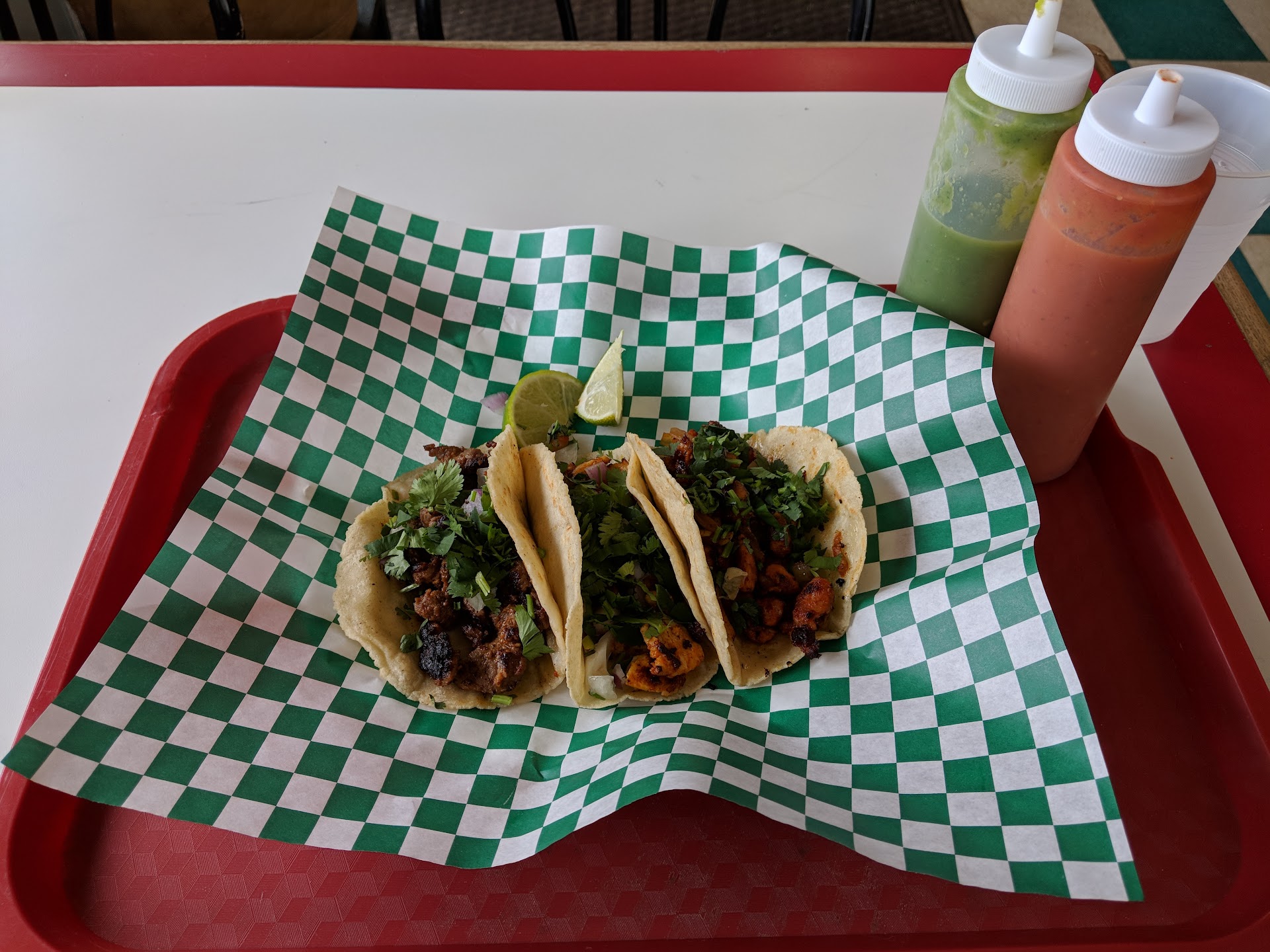 Tacos de Pollo - good level of flavor, chunky and charred. An average taco when paired with the sauces.