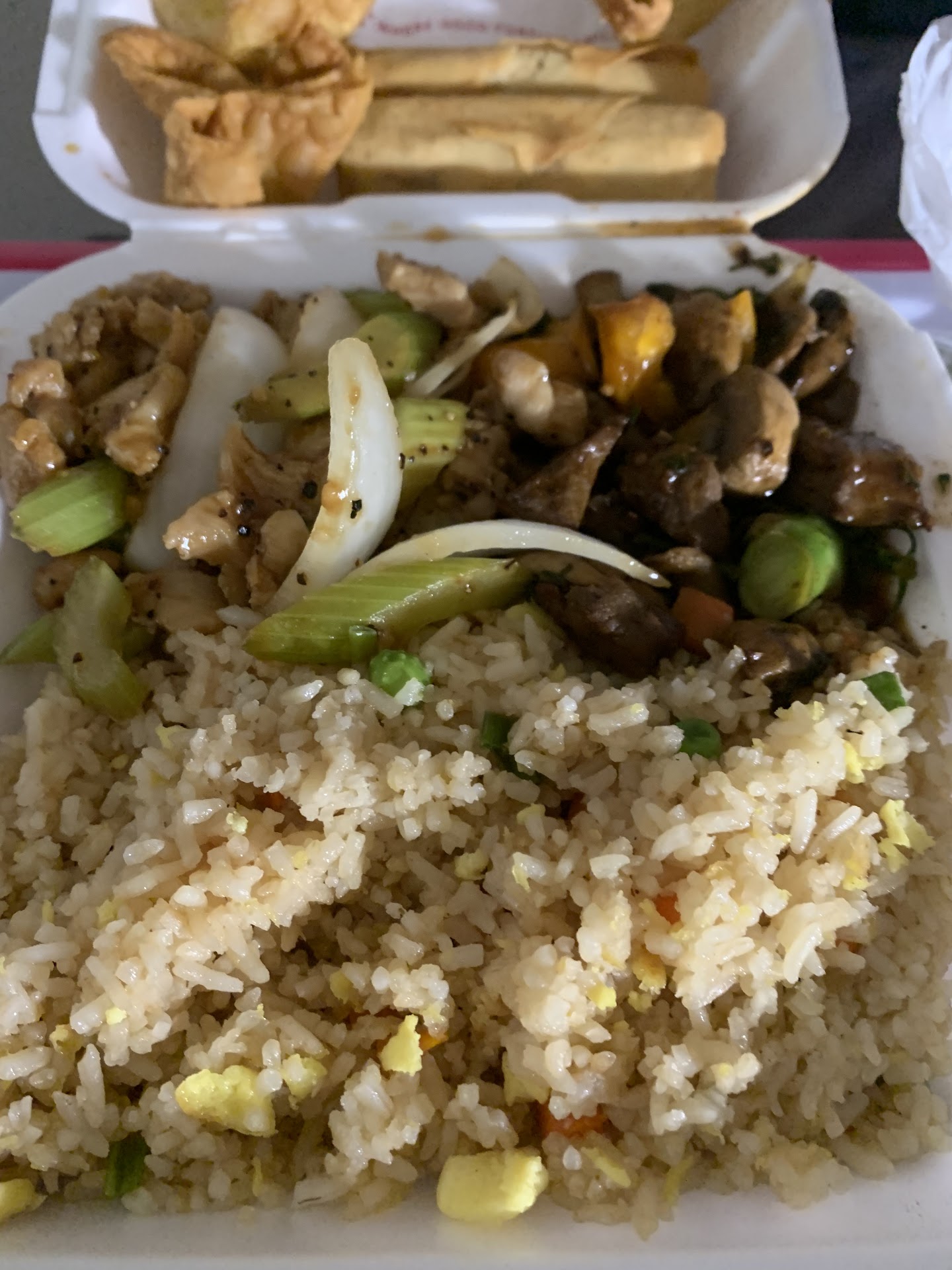 Read moreMy husband stopped here the other night because our power was out (wind storm) and bought $50+ worth of food. They placed it all in a box and when he came home, the bottom fell out and it landed on the sidewalk. I have to say, they get 5 stars for replacing the entire meal without any issues. I do have some complaints about the food, however. There were three different main course dishes. Shrimp, beef and chicken. The chicken dish had such a weird smell, I couldn't bare to eat it. The beef was "ok" and the shrimp was delicious. The rice, both the white and the fried, may as well have been raw. Also, I get that the cost of ingredients have gone up but the meat was so sparingly in these meals, it was a shame. Also, there were so many red peppers (the sweet ones) in each dish, just to make up for the lack of meat, I think. And why add a few mini stalks of broccoli if you're going to add so few?? The chicken smell stayed in the house all night and the next day. It was gross. I did enjoy the shrimp though. And, the customer service...