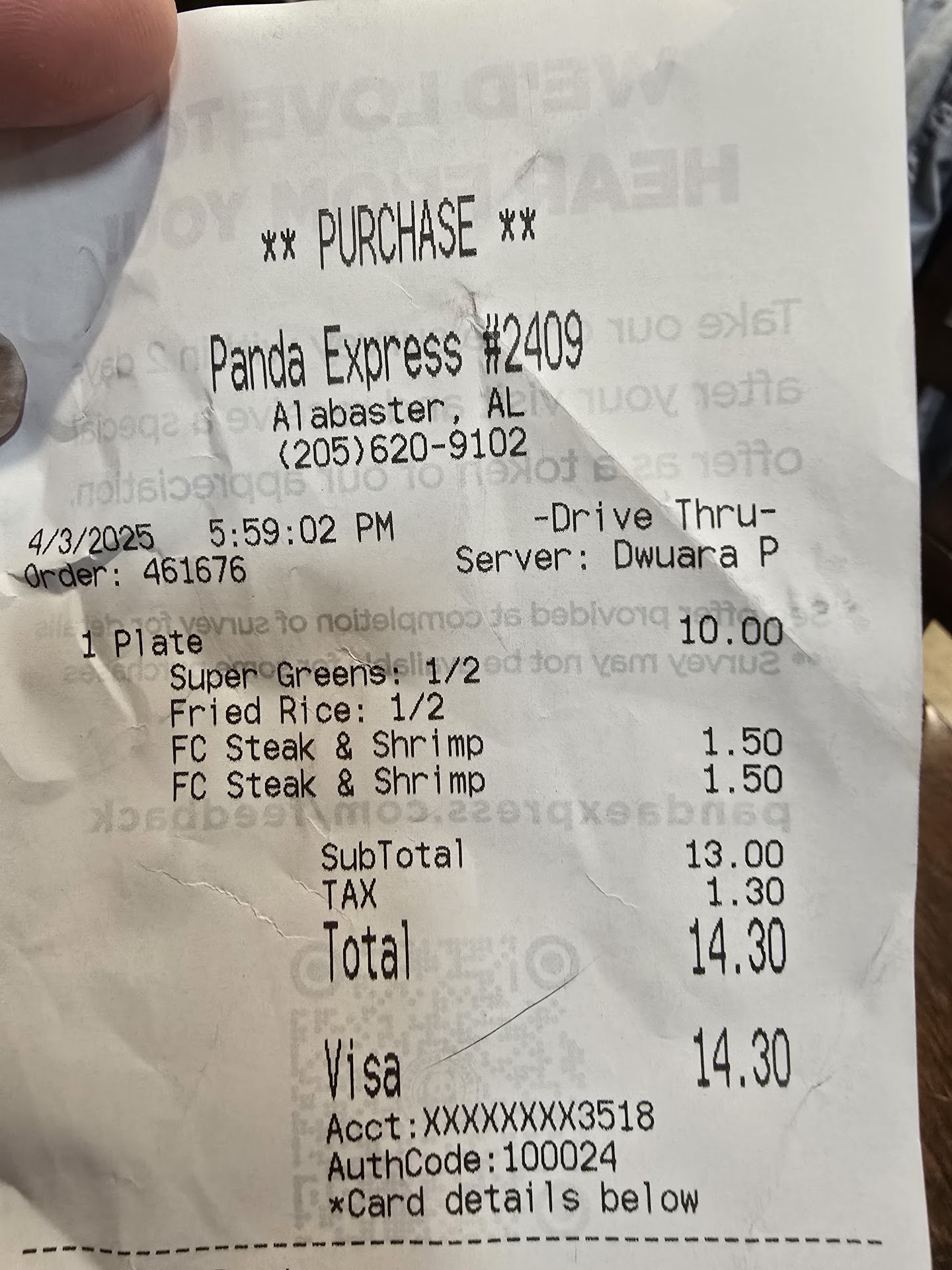 Today, August 7, 2022. I ordered 2 half fried, black pepper chicken and the black angus steak which I had to pay $1.60 more for. Also, I ordered the spring rolls and they were cold. My 2 orders of cheese Rangoon wasn’t just cold but hard and very crispy like it had been sitting out for a while. I’m very disappointed with my order. Also, the black pepper steak I paid extra for was only 3 or 4 piece’s of meat the rest were vegetables. that’s it. They added so many mushrooms and a dark green vegetable to it that makes it seem like you have steak but you don’t. I took pictures so you can see exactly what I receive. However, I didn’t realize it until I started looking for my meat otherwise I would have ask for a refund just like asked for cheese Rangoon. Plus, I called and talk to the young lady there and told her to put light soy sauce in my fried rice because I didn’t want it white but as you can see from my pictures she didn’t do it. I will not be ordering from them again. Celebrating Birthday was very disappointing with Panda Express. However, I would like to say that I did call but the manager wasn’t there and I talked to Blessing ( young lady) she offered to give me another order but I stated no thanks and she was sorry. I give her 10 Stars for...