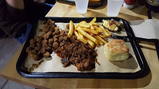 The burnt ends is my favorite meat here. It's so smoky and tender and juicy, you don't even need the sauce on there for it to be delicious. The smoked jalapenos are always amazing. They're smoked with a piece of cheese in them and wrapped in bacon. My only complaint is that I only get two as a side. French fries were crinkle cut, standard. The fried okra is always hit or miss, honestly. This time, it was a hit. I loved them. Super crunchy with the okra still ok and delicious inside the breading.
