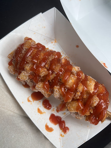 Once we got our order in it came out within 10 minutes. The employees are super nice and patient since my friend and I were both new to this. The jalapeno ranch and garlic parmesan sauces were amazing. You can have the sauces either drizzled on top of your corn dog or on the side. All sauces are free and don't charge extra. I also got my corn dog lightly coated in sugar which was perfect. My friend didn't think the employees would dunk hers so much but hers was covered in it. We both orders the mozzarella and hot dog one and loved it.