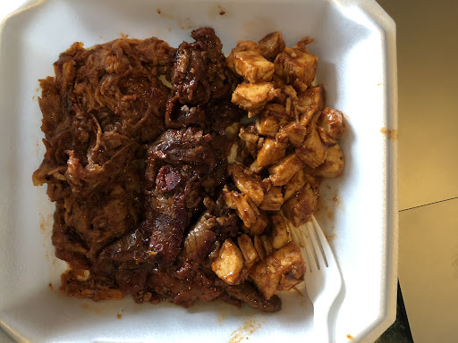 But I opened the lid and it was just three big piles of meat, each doused in bbq sauce. My guess is the meat was reheated on the flat top and rather than drying it out they heated it with sauce. But with brisket, I was hoping to see a nice smoke ring around the beef. It just resembled pulled beef. The chicken was by far the most disappointing. This was straight baked chicken breast (extremely dry) that had been cubes up and tossed in bbq sauce.