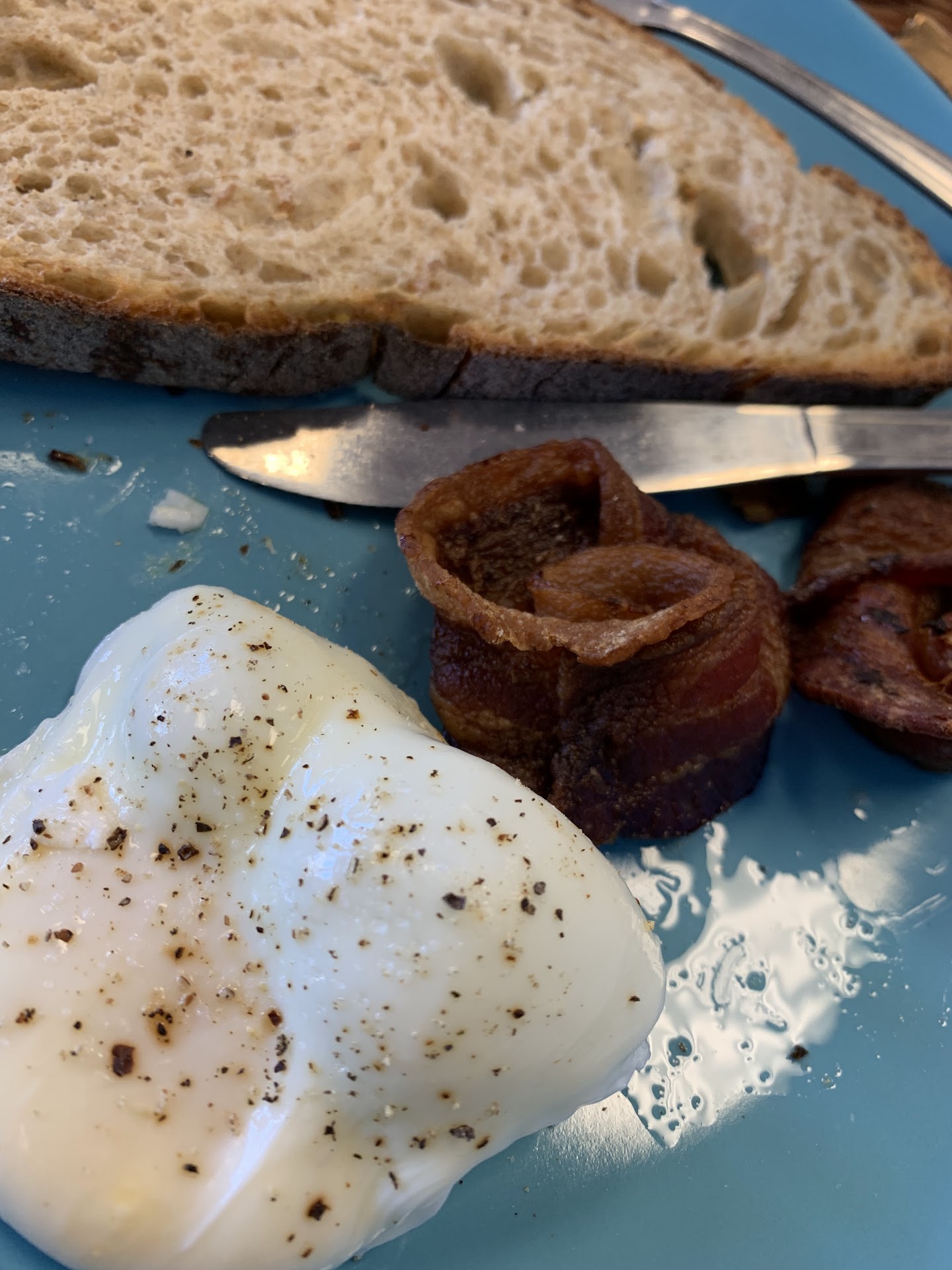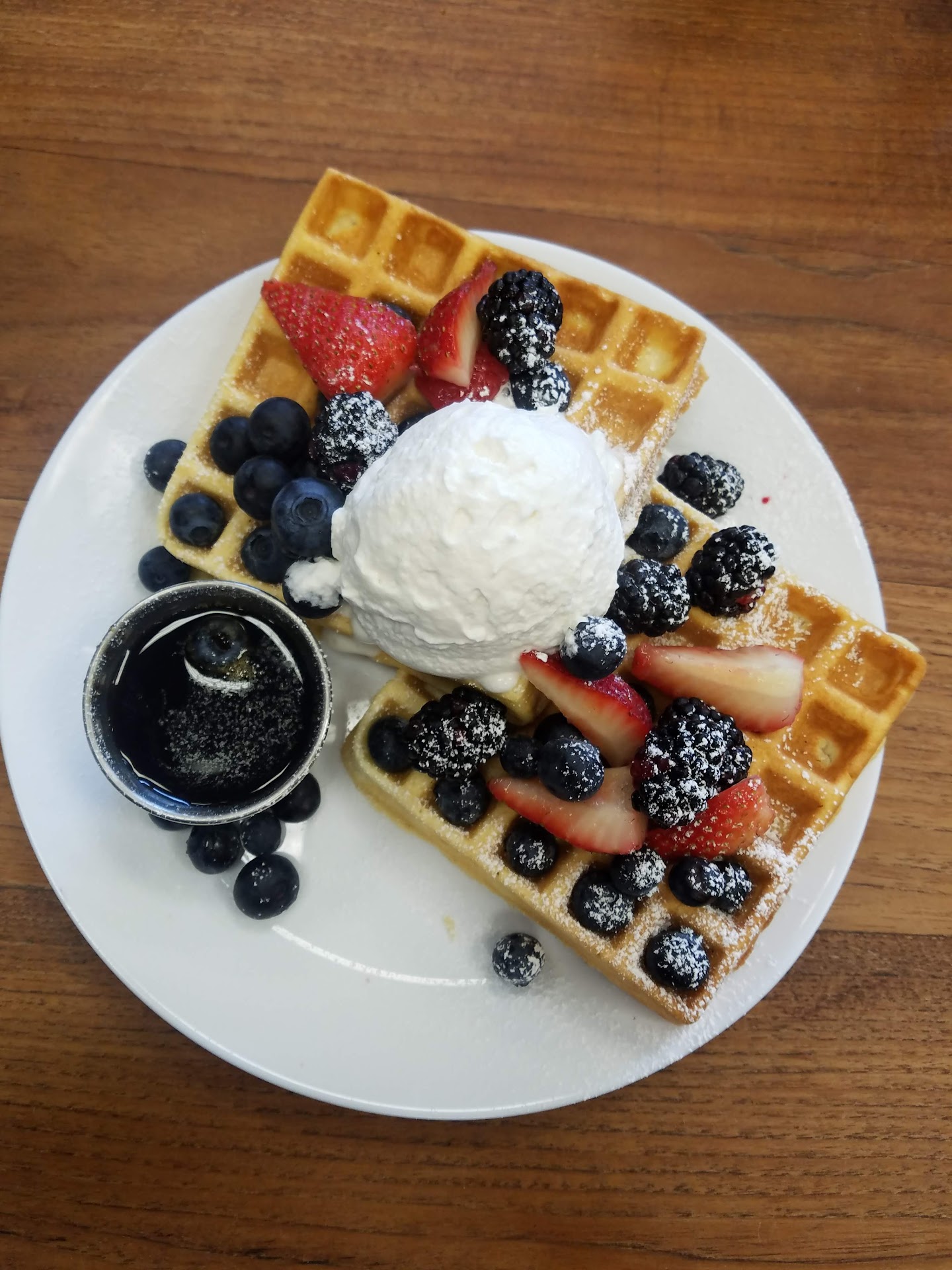 Their baked goods on display at the counter were an exercise in resisting temptation. We tried their strata and the waffle with fruit. The waffle was nothing too exciting but my little one was thrilled at the amount of whipped cream, butter, and fruit it showed up with. My strata was an unbelievably light and fluffy affair with leeks and bread, and a wonderfully crisp top hat. The only downside to the meal was how their bacon showed up- little porky 'rosettes' they were rolled up and baked so it was baked unevenly, the tops done. Overlooking that small infraction, and the tight seating, especially at the communal table next to where folks in line are, we enjoyed our brunch. Hopefully you'll be as delighted as I was when you pay a visit. bonus point for the employee wearing...