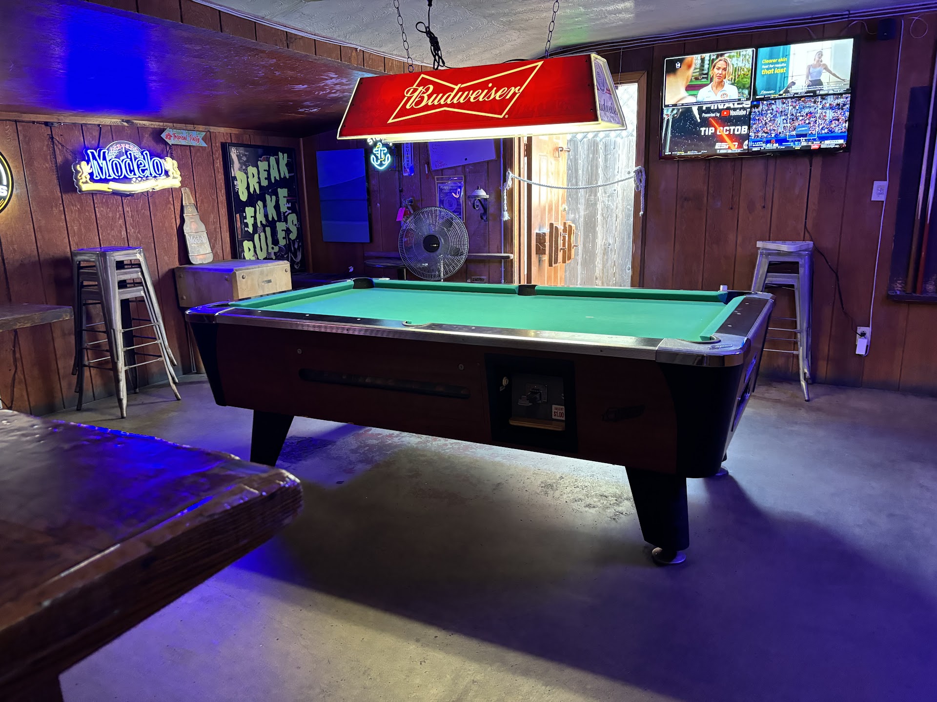 The ambiance is nicer and it is not lit. It is also cleaner. They have a pool table at the end of the bar. There is an outdoor dining area in front of the bar.