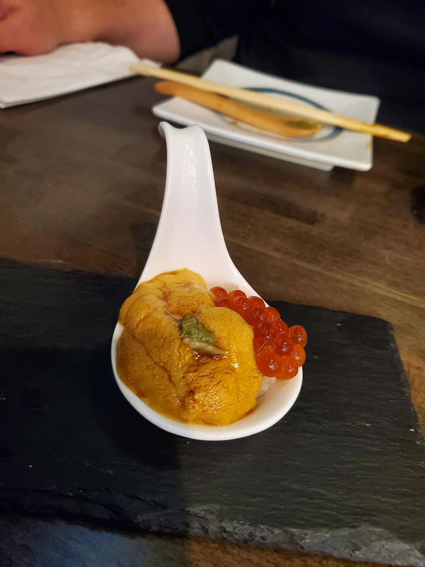 Mango paradise which has crunchy tempura shrimp in the middle and finishes sweet was a guilty pleasure. The uni spoons were also very good.