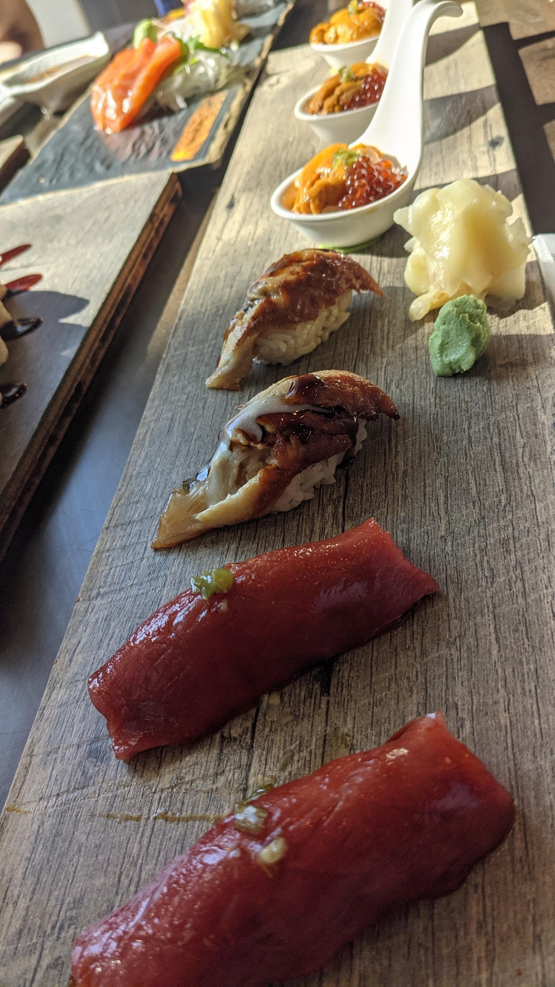 We ordered two sets of the omakase, a mango paradise and Santa Barbara uni in a spoon. Nigiri was carefully prepared and poised on a very long wooden board. The sushi was mixed. Toro was excellent. Shrimp disappointed and the head was over-fried. A few others lacked depth of flavor or texture. There was sea bass, aji, scallop, ocean trout which looked like a dark salmon and then I lost track. It was a mixed bag of sushi but only if you are super picky. Overall, it was very good and thoughtful.