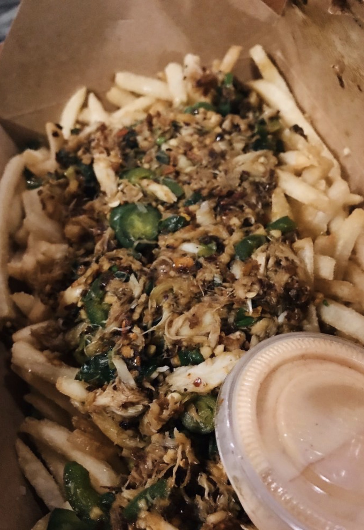 Read moreFound this place after going to the brewery next door. We didn't know you can bring your beer here from next door and order food here!!! We walked and saw they have food and ice cream!!! It smelled delicious when we walked in. There were so many good options on the menu it was hard to decide what we really wanted. We ended up ordering the salt & pepper wings with garlic noodles, lemon pepper wings, spicy garlic crab fries, hot cheetos elote and salt & pepper mozzarella sticks. We didn't know each item came with fries, so we ended up with a lot of fries. The wings were flavorful, you can really taste the salt, pepper and lemon in each bite. The crab fries could've used more crab. The salt pepper mozzarella sticks were ok, don't think i'd order that again. The hot cheetos elote was delicious. The hot cheetos gave it that spice and crunch to it. We also ended up getting ice cream. They have a good variety. I got the mocha crunch ice cream. It was creamy and had the right amount chocolate in it with coffee. I will definitely go back to this place to try out the other items...