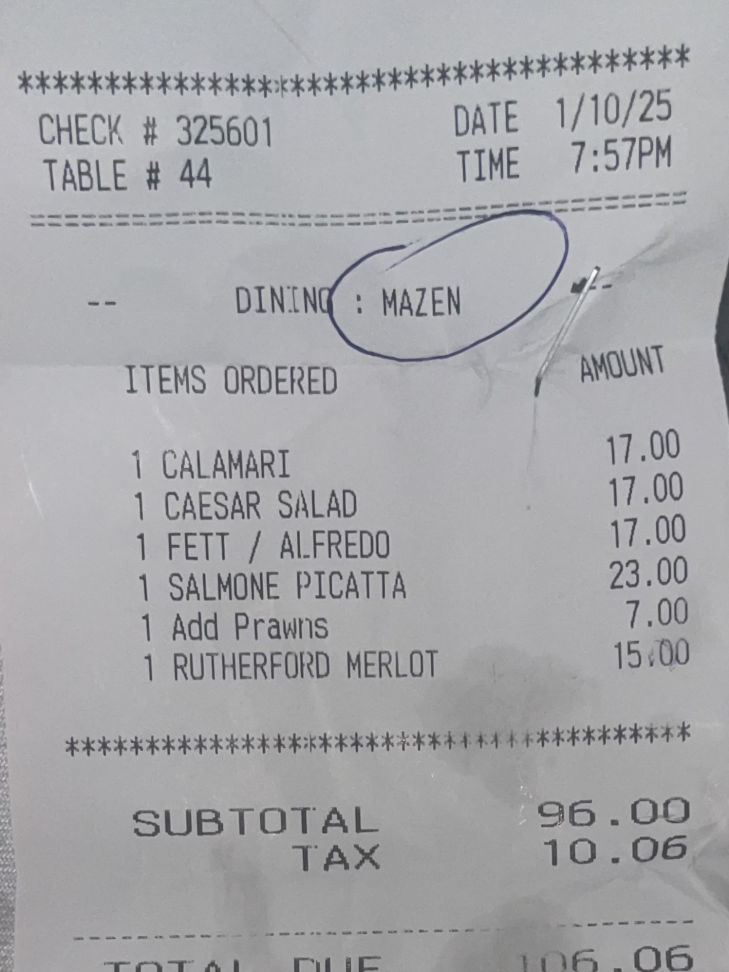 Service was a joke. If you can even call it that. Our server was Mazen. 5 parties in the entire restaurant on a Friday night at 7:15pm. Service should have been impeccable, but instead it was offensive and ridiculous. I took my mother and 15 year old daughter here for the last dinner of my mothers winter visit. It was supposed to be special.