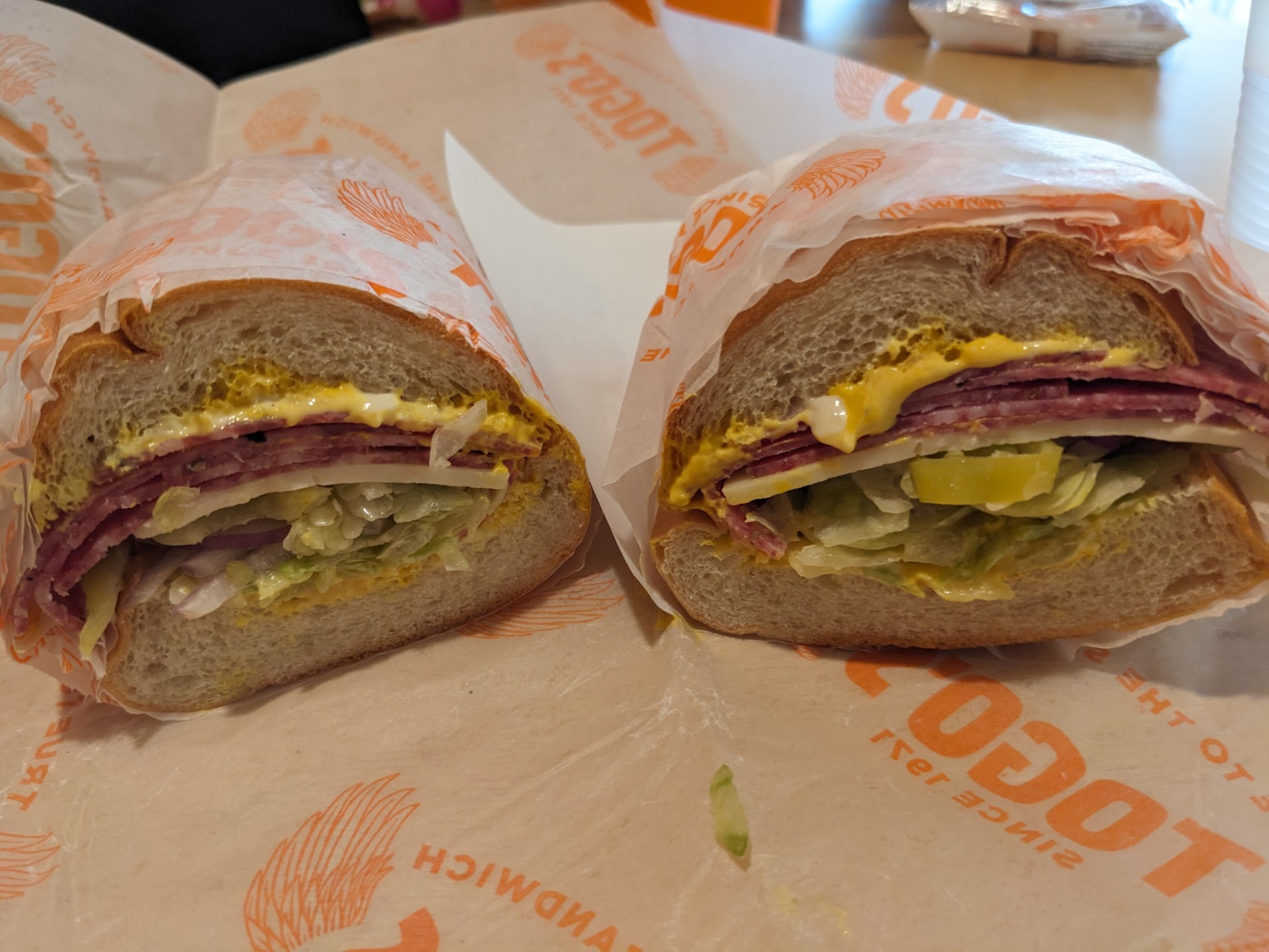 This has to be poorest managed staff I have seen at a togos. 4 employees all trying to manage what I assume was a big order/delivery orders and walk in customers. I ordered 2 cold sandwiches and it took 40 minutes from enter to exit. The order itself was 20 minutes. The whole staff looked like they were jumping between orders instead of tasking out who is handling what type of orders. My sandwiches only okay. I feel bad for a staff that is poorly managed because they have to be met with the frustrations of the...