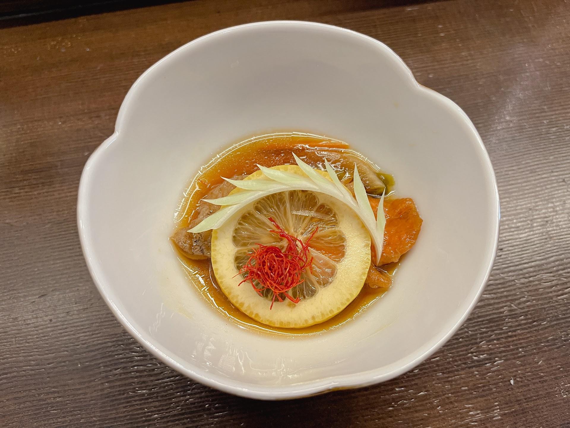 Akadashi (miso soup with zucchini, mushroom, and tofu skin) Peach Jelly (slight sweetness, not overpowering)