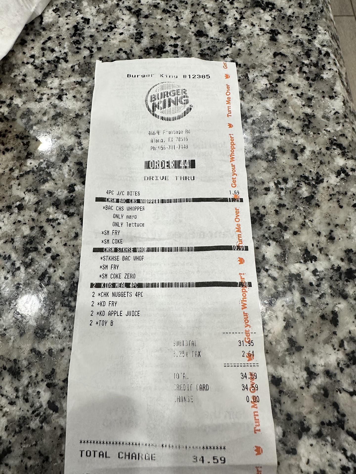 We head home. Realize the fries have 0 salt on them. Those two 4 pc nugget jr meals, turn out to be 3 pieces. Each missing a nugget. Those jalapeño poppers, shriveled up husks of a popper with little to no filling probably from sitting under a heat lamp for what was probably hours. On top of that, our mayo and lettuce burger had everything on it, not even remotely how we ordered…. Too far to go back and argue and our kids were nearing bedtime.