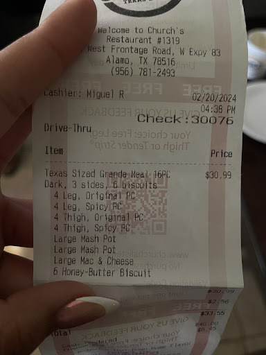 Read moreI buy a meal x 19.99 but the coleslaw was in bad conditions . The chicken was overcook and looks old and greasy. I call to the store I make like 15 call so the manager in shift name Cristian mata tell me she needs to know how many pieces I eat before because she can give chicken free because cameras . So I live like 7 miles from the store I explain what happen and she to be honest I fell she don't care say me bring the chicken to confirm you don t eat lol really ....sad I say her I take pict but she say no you need to bring the chicken back so really she don't want to help me out .please don't go church's chicken manager don't care about...