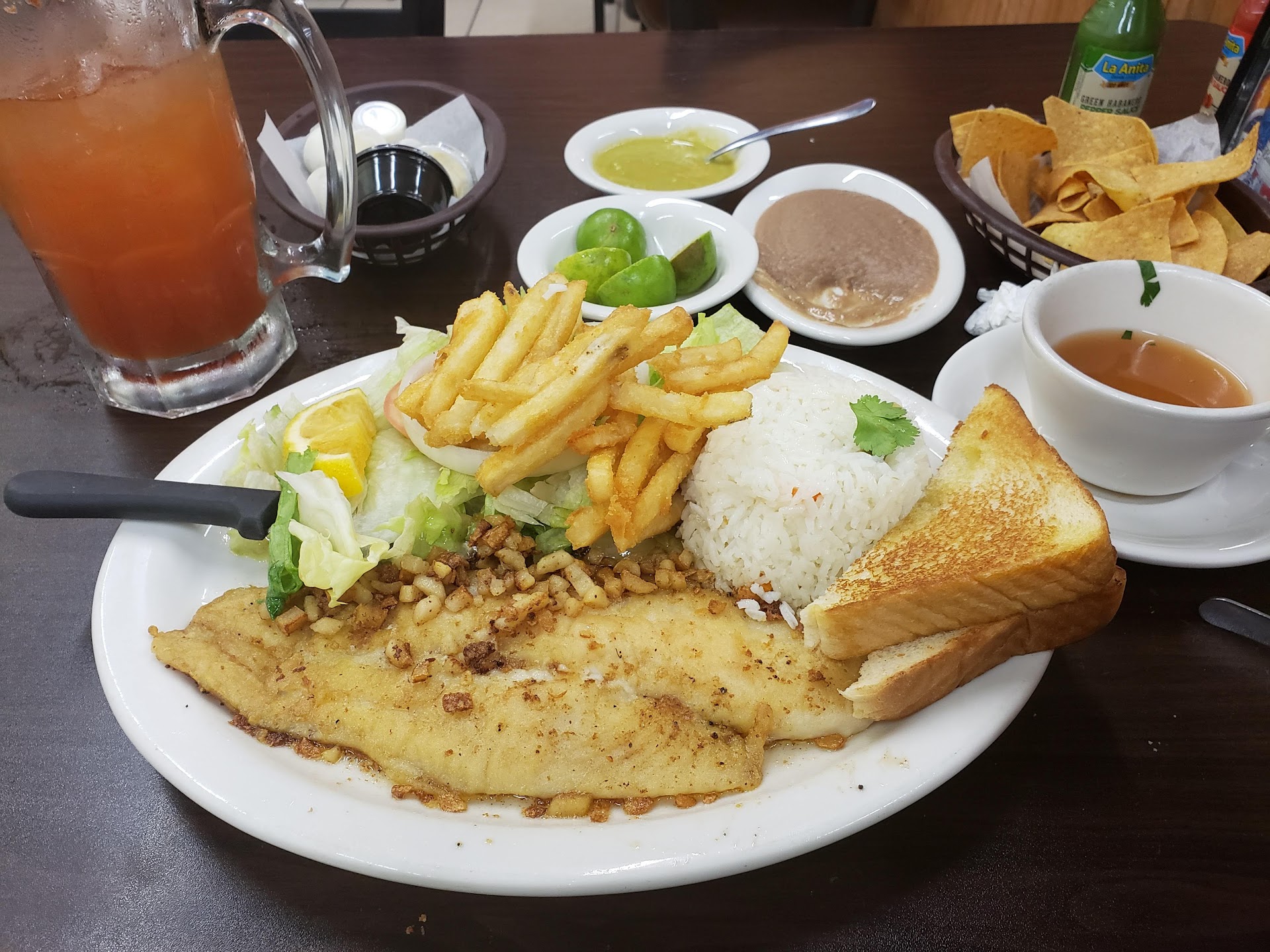 Read moreFirst time here n my wife n i were very impressed. We got the sea platter for 2 which was more for 4. 2 shrimp cocktails, 2 ceviche tostadas, 4 large fried shrimp, 4 large tilapia fillets , 2 tasty stuffed crabs, a pile of fries n onion rings, 4 slices of texas roast, a nice pile of either rice with shrimp or with octopus, n a large salad. They start u off with a small veggie consume (soup) with refried beans, chips n a nice spicy green salsa. We came home with 3 fillets, most of fries n onion rings, toast, salad, most of the rice with shrimp, fried shrimp. all very good. Only thing was it was close to closing, so waiter was more occupied with end of day duties. We will...