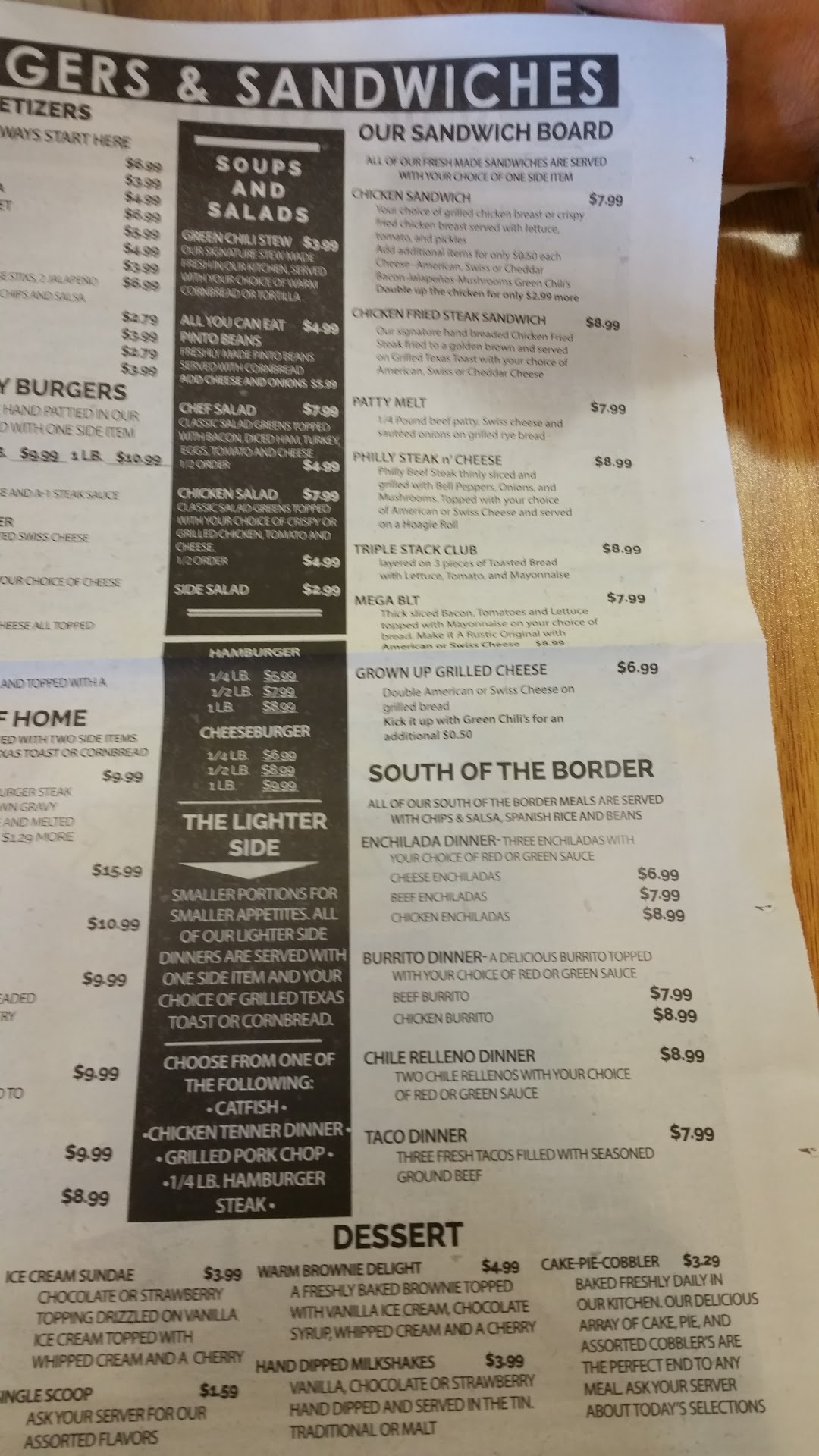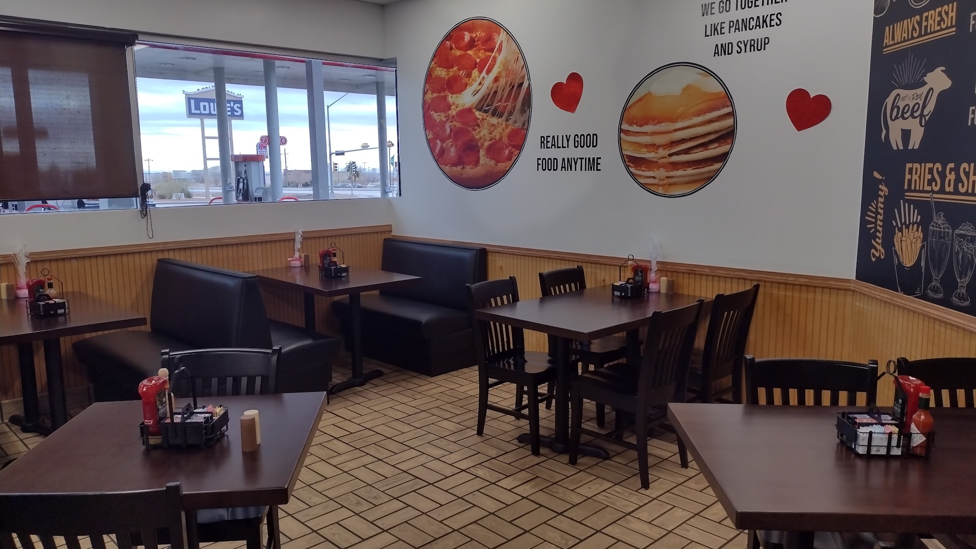Read moreFirst, I got an order to go because I was in a hurry. I ordered Huevos Rancheros, over medium on the eggs. Every yolk on my eggs were broken, the refried beans were crusty scraping off the side of the pan and for all that it took 42 minutes to get the order prepared and out the door. My order did not include utensils or the side condiments for each item. The worst thing was sitting there watching the old waitress with the bad bleach job, eat, touch her face, bus tables and then grab people's food and take it to their table. As a Truck Driver, I could have fueled at Alsups for 10 cents a gallon less and at 100 gallons that is 10 dollars. And that 10 dollars would have gotten me 2 egg McMuffins and a large coffee with change. I have ate inside and the portions are larger and hotter...I imagine there is a sense that there is no accountability with 2 go orders, with people you don't see everyday. But reality is, I have stopped here minimum of 3 times a year for over 20 years and what I experienced and what I saw will force me to consider other options next time through. I know it won't break you, but it is no way to build a business either. The waitress needs to be retrained or fired. I told her to go wash her hands at one point, so you know...