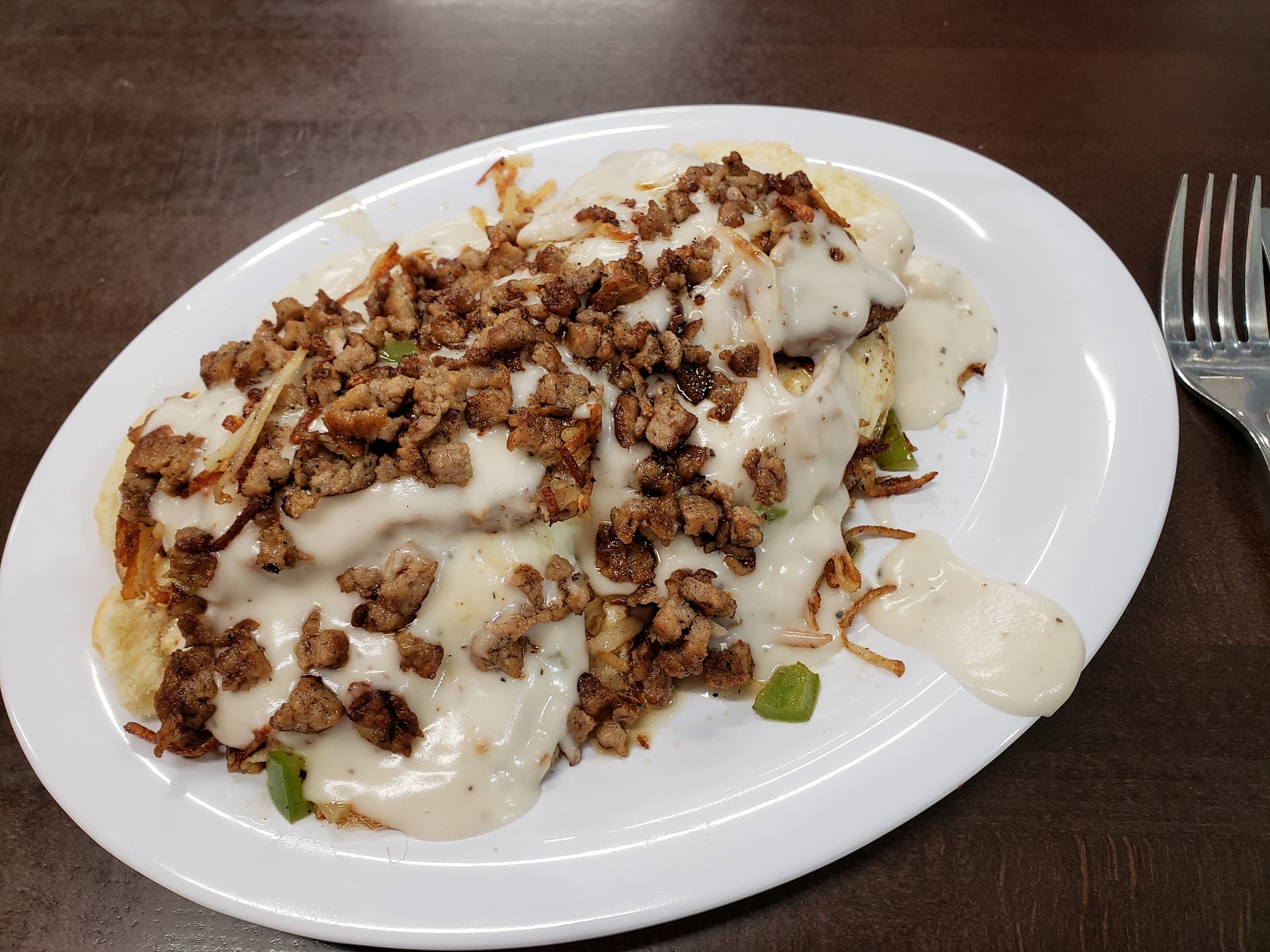 Food: Rustic skillet; horrible pre-processed made from frozen biscuits. Suppose to be flaky open face. What I got was two whole completely soggy biscuits. Gravy was suppose to be sausage gravy. Did not see any sausage in the gravy, looked like normal white gravy. Two sausage patties, no flavor. Probably counted as the sausage suppose to be in the gravy. Onions, bell peppers, shredded cheese, Flavor as normal.