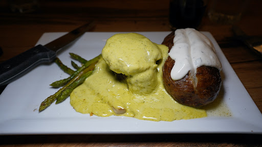 I ordered the filet steak, requesting it to be cooked medium, but it arrived closer to medium-well. Despite this, the steak was still quite flavorful, though the dish was overwhelmed by a heavy-handed amount of sauce. It drowned out the natural flavors of the meat, which was disappointing. I had also opted for the "Oscar Style" preparation, expecting fresh, succulent king crab lump meat. However, it was served with a mediocre crab cake on top, which fell short of the experience I was hoping for. The accompanying potato lacked seasoning, and with no salt or pepper on the table, it felt like the final touches were missing.